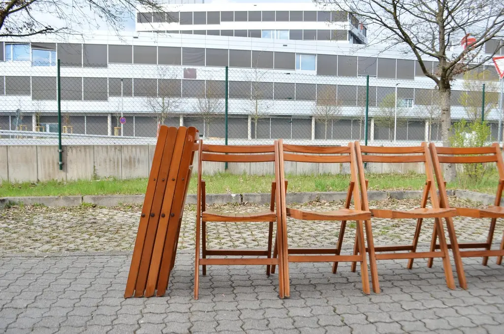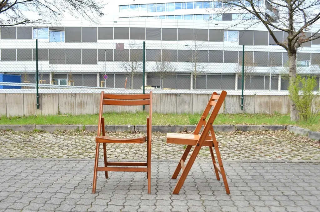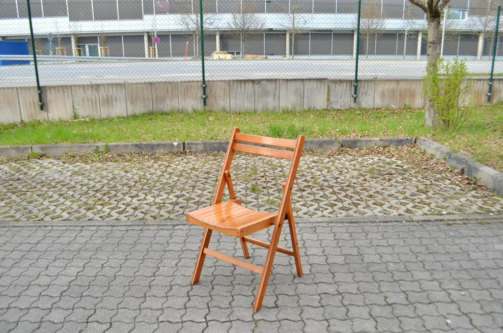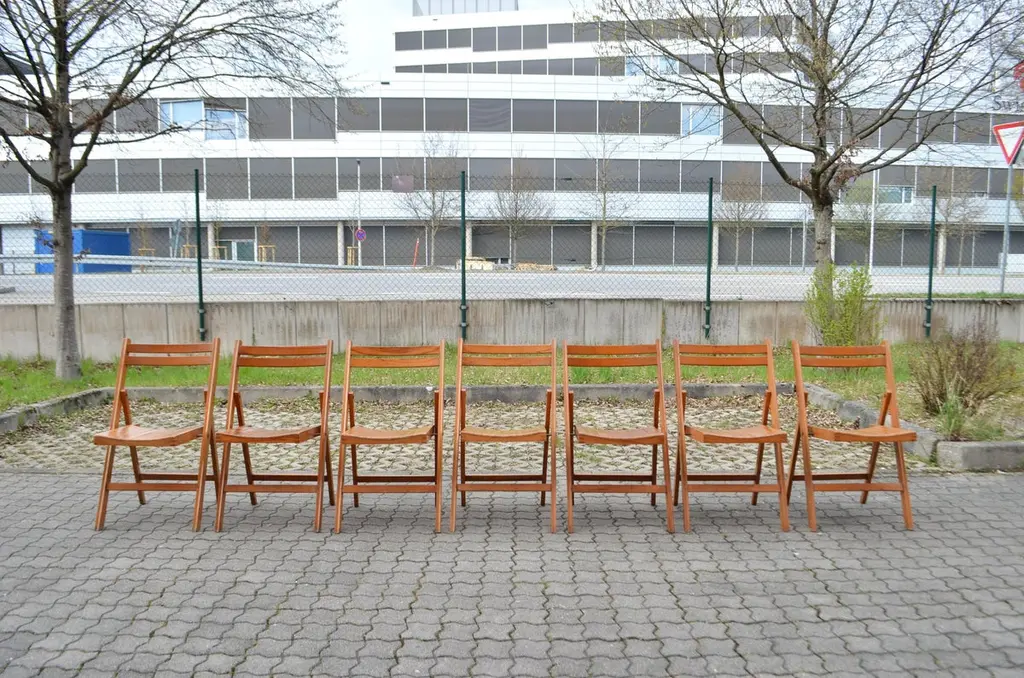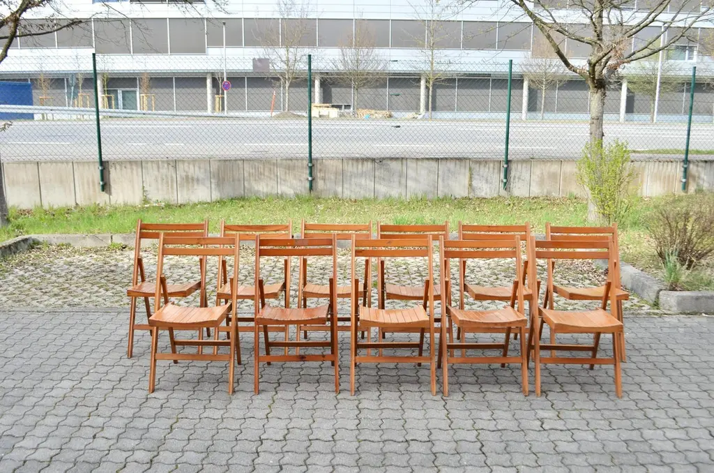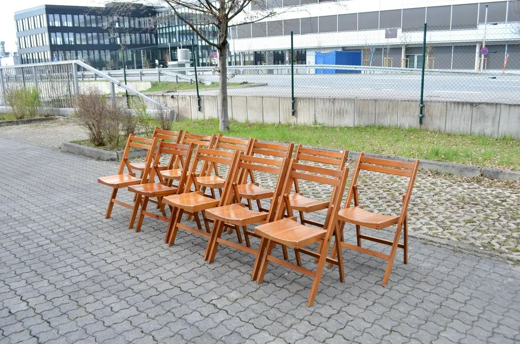 This Mid Century folding chair was manufactured back in the old days 70ties in Yugoslavia.It is made of solid beech wood. It has a beautiful honey colour.Some wear and Patina. Comefortable seating.It is stackable.Price for 1 chair.We have 11 chairs in Stock.