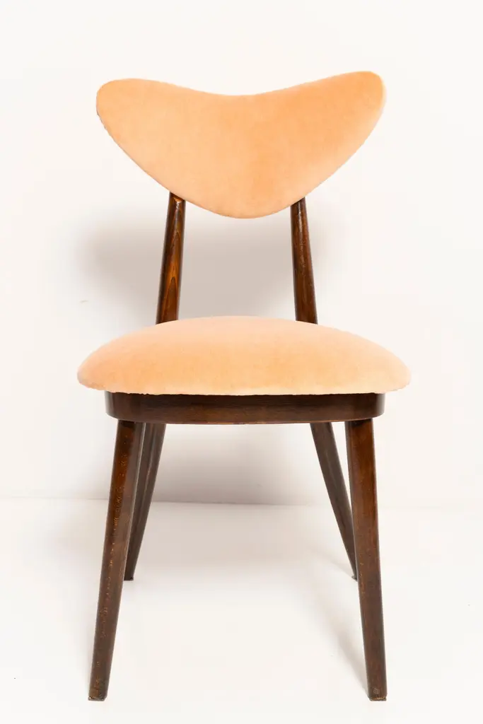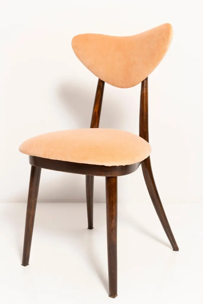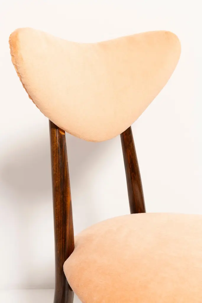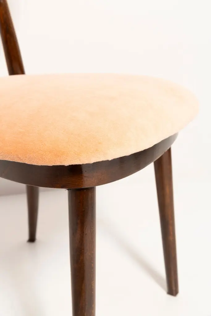 Chair type A5828. Colloquially called "heart". The furniture was designed by Helena and Jerzy Kurmanowicz. Chair was produced in Radomsko Woodworking Factory and we thoroughly renovated them. The construction is made of beech wood dyed with water stain brown. The chair is protected with acrylic varnish with a satin glow. The upholstery fabric was produced in the clean boo technology and has water-repellent properties. This means that the fabric limits the absorption of liquids. Spilled liquid on the surface will form balls. The chairs have undergone orange cotton-velvet (color 07). Abrasion resistance category A (60,000 cycles). We can prepare also bigger sets 2, 4, 6, 8 or more chairs in different wood and velvet color.