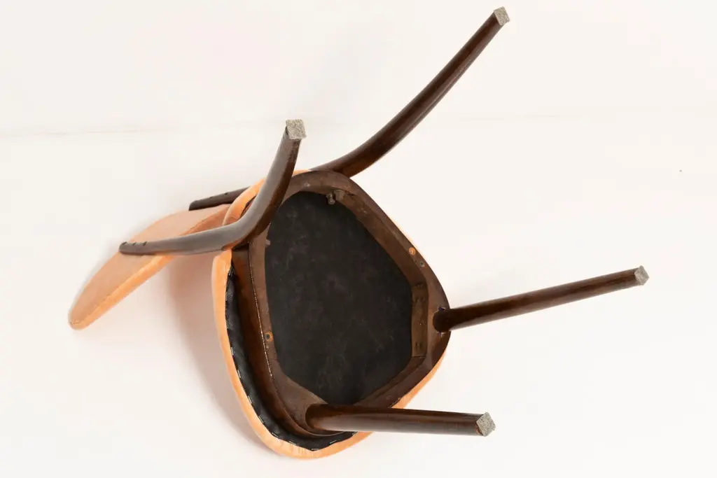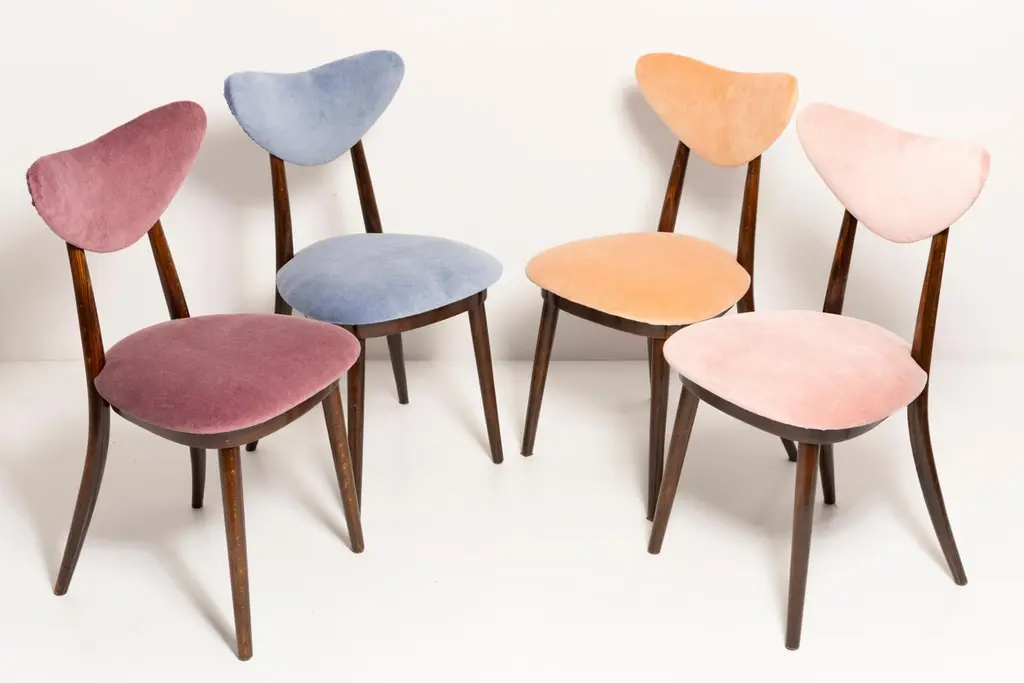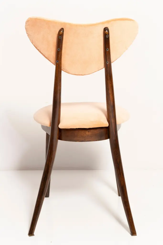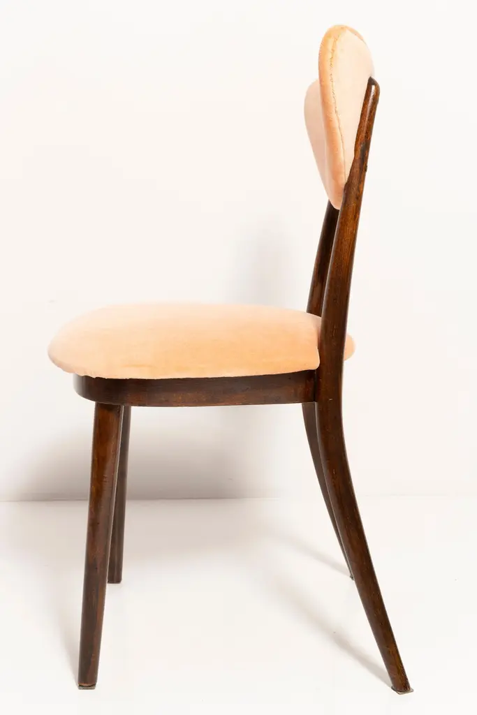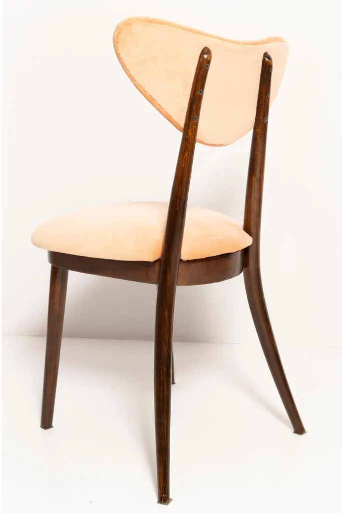 Chair type A5828. Colloquially called "heart". The furniture was designed by Helena and Jerzy Kurmanowicz. Chair was produced in Radomsko Woodworking Factory and we thoroughly renovated them. The construction is made of beech wood dyed with water stain brown. The chair is protected with acrylic varnish with a satin glow. The upholstery fabric was produced in the clean boo technology and has water-repellent properties. This means that the fabric limits the absorption of liquids. Spilled liquid on the surface will form balls. The chairs have undergone orange cotton-velvet (color 07). Abrasion resistance category A (60,000 cycles). We can prepare also bigger sets 2, 4, 6, 8 or more chairs in different wood and velvet color.