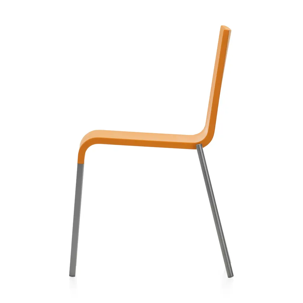 Maarten Van Severen’s chair is an elegant essay in form and function. The minimal, stacking design (up to 10 chairs high) combines a strong steel and aluminum frame with a resilient polyurethane foam seat and back that yields to the sitter’s body. It also flexes comfortably thanks to springs embedded in the backrest. The striking simplicity of Van Severen’s design has earned it a place in MoMA’s collection. It’s ideal as comfortable seating for reception areas and meeting rooms. Available in seven colors with smooth silver bases. Made in Germany by Vitra, a manufacturer of iconic modern furnishings that’s widely represented in the Museum’s collection.The son of an abstract painter, Maarten Van Severen studied architecture in Ghent, Belgium. He began designing furniture in 1986, pursuing perfection in form and fabrication from his Ghent workshop. He works in a wide variety of materials, from aluminum to bakelite, exploring the strengths and limitations of each. He frequently collaborates with Rem Koolhaas as a furniture and interior designer for residential commissions. Six examples of Van Severen’s chair designs are included in MoMA’s collection.