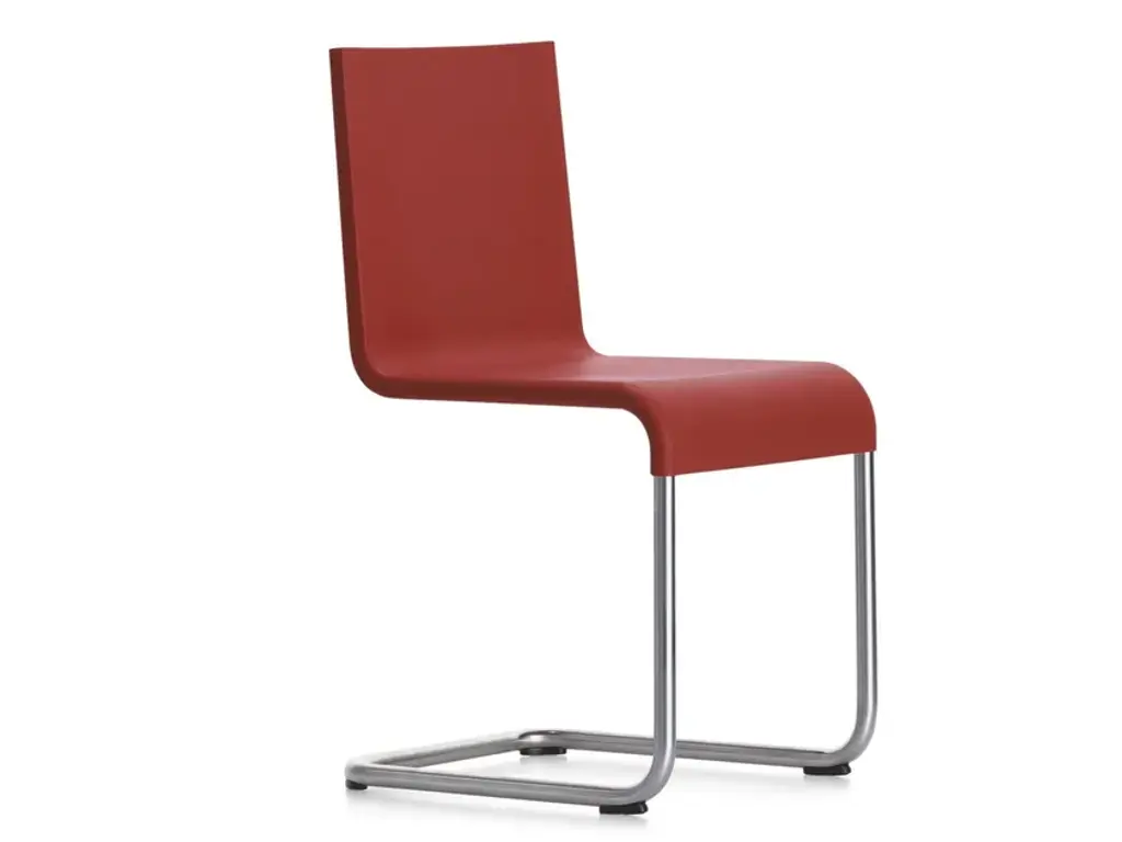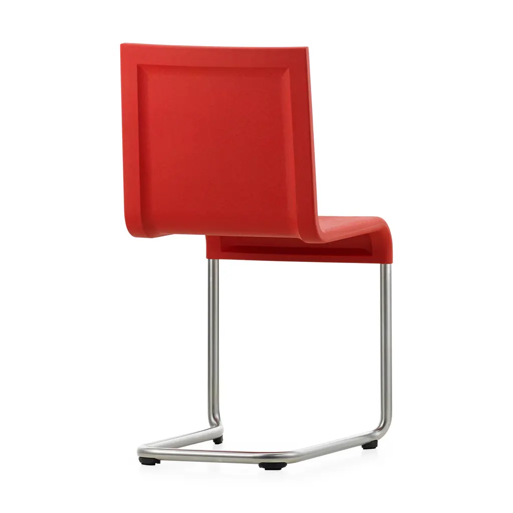 Maarten Van Severen’s cantilevered chair is a seamless union of form and function. The minimal design combines a strong, tubular stainless steel frame with a resilient polyurethane foam seat and back that flexes comfortably and yields to the sitter’s body. It’s ideal as comfortable seating for reception areas and meeting rooms. Available in five colors with stainless steel bases. The chair is suitable for outdoor use, but should not be left in the sun for long periods to avoid fading. Made in Germany by Vitra, a manufacturer of iconic modern furnishings that’s widely represented in the Museum’s collection.The son of an abstract painter, Maarten Van Severen studied architecture in Ghent, Belgium. He began designing furniture in 1986, pursuing perfection in form and fabrication from his Ghent workshop. He works in a wide variety of materials, from aluminum to bakelite, exploring the strengths and limitations of each. He frequently collaborates with Rem Koolhaas as a furniture and interior designer for residential commissions. Six examples of Van Severen’s chair designs are included in MoMA’s collection.
