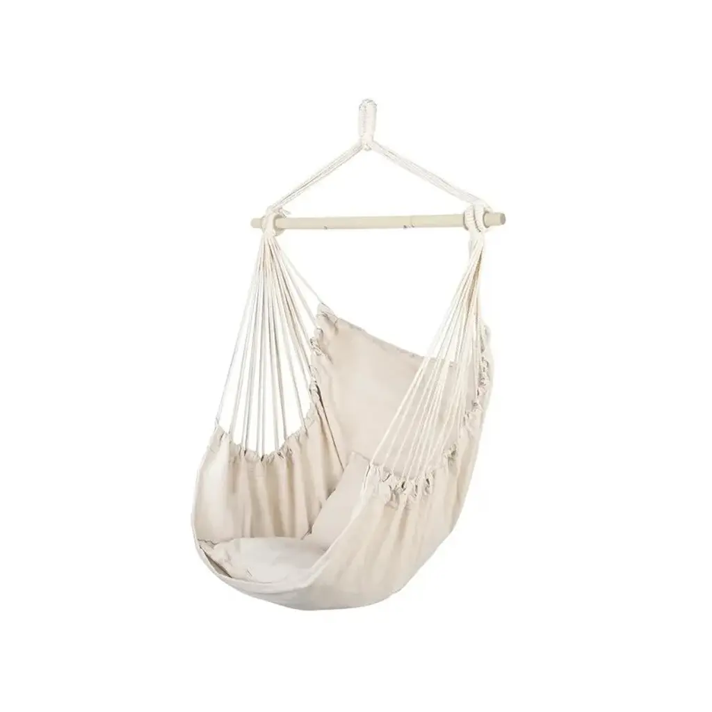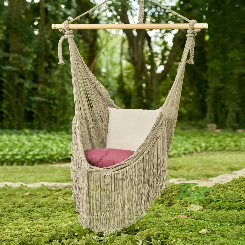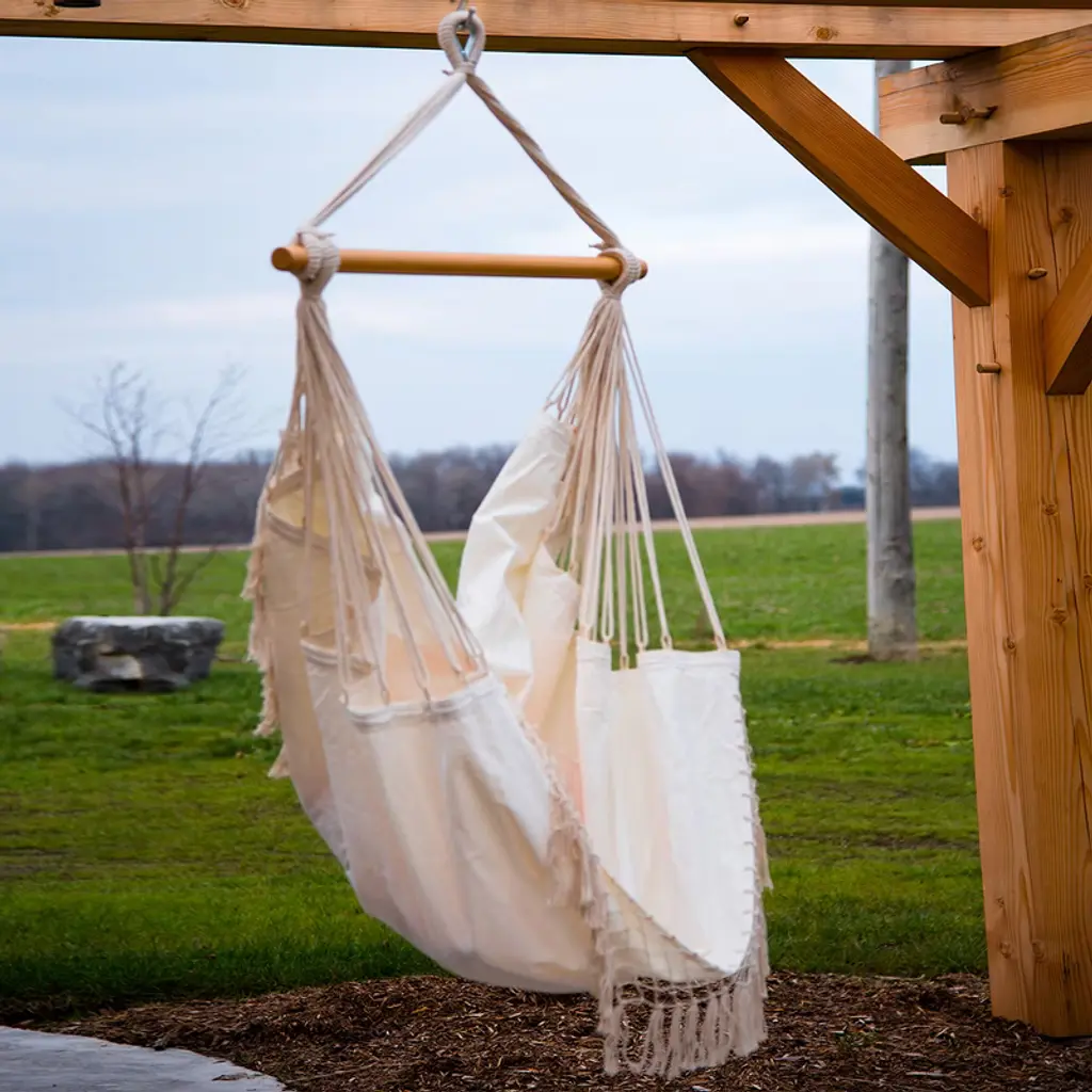 This Brazilian Hammock Chair is constructed of tightly woven 100% cotton, making this the most relaxing chair you will own. Now available in ten specially-selected color combinations with a coordinating, hand-crocheted fringe on both ends that adds a Bohemian touch to any space. Once set up, there's additional fabric that stretches up behind you, providing you with the perfect place to rest your back. The hammock chair can be used both indoors and outdoors due to its small footprint and arrives with the wooden spreader-bar and additional sling. The hooks and springs are sold separately.