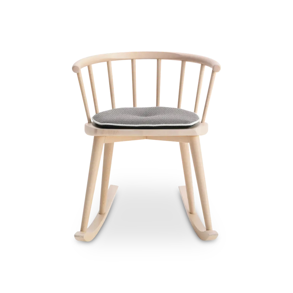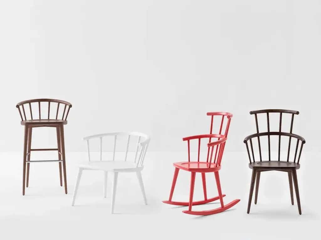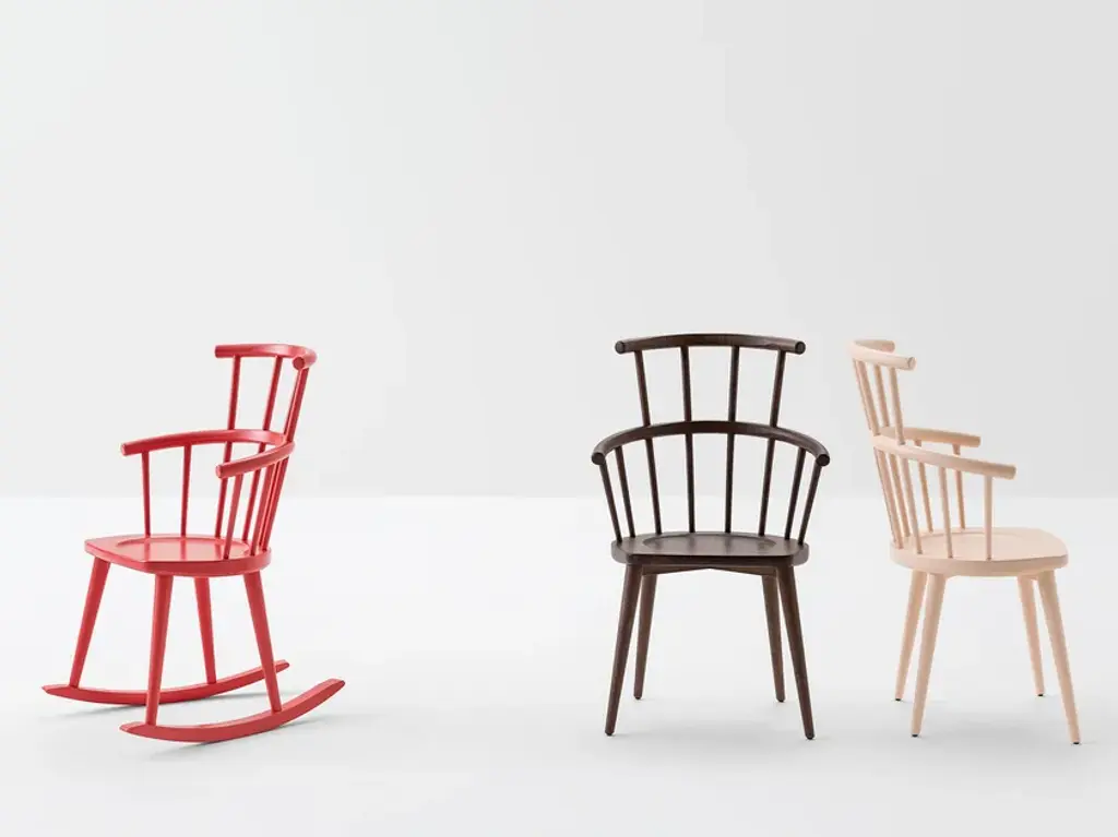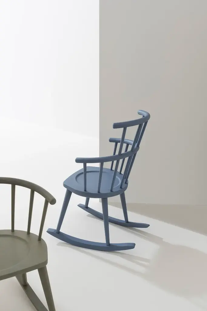 W. 604 is a rocking chair with armrests and a high backrest, featuring a solid beech wood frame.W. is a collection inspired by the classic Windsor chair.Thus was born W., whose very name reflects the process of reduction and subtraction it embodies.As one of the most prolific chair types in design history, it is distinguished by its unmistakable backrest featuring a curved horizontal element and spindles that insert into the seat, where the material is reduced to the minimum and the angles and relationships between parts are thoughtfully redesigned.A contemporary classic, W. comes in a range of variants, including a rocking chair.