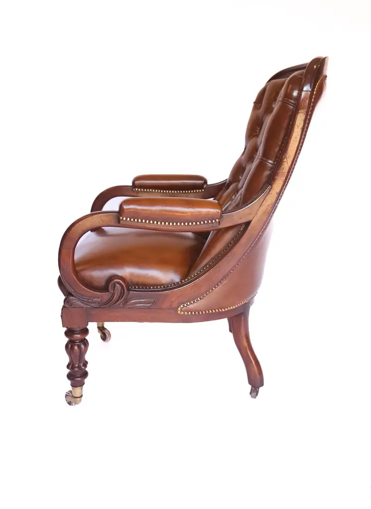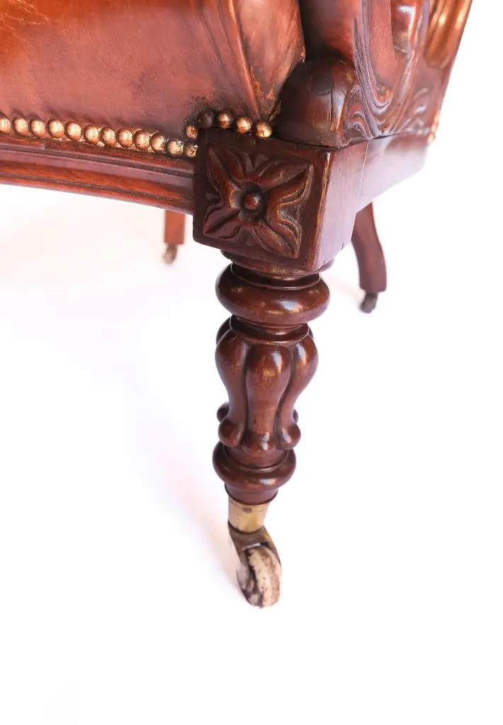 W1V Mahogany & carved leather Library ChairWilliam 1V period 1830-1837Mahogany frame, with open scroll armscarved detail on front.Deep Buttoned back, recently re upholstered & covered in leather & colouredtoo chestnut, Splayed legs at back,Carved Tulip shaped legs at front with Brass cup castorsSeat Height :49cm