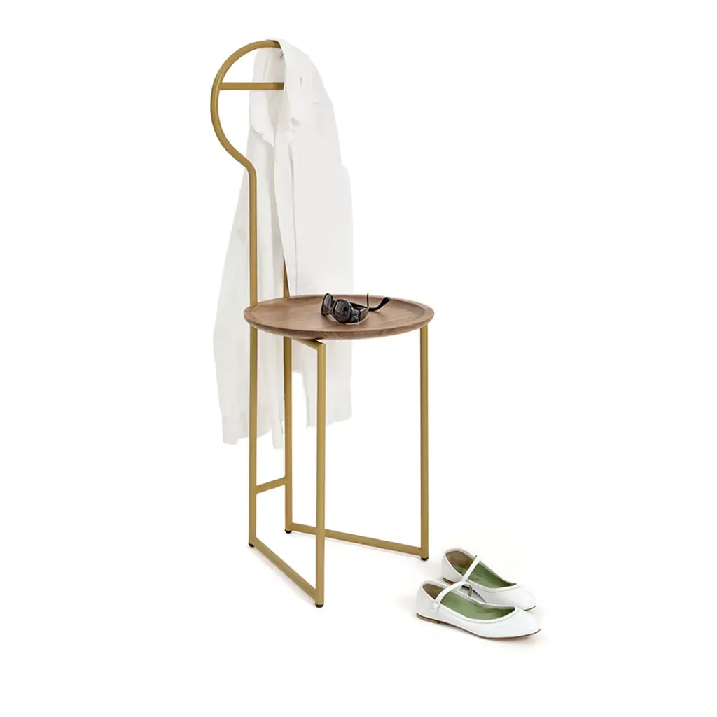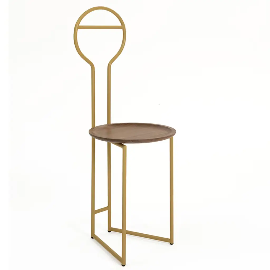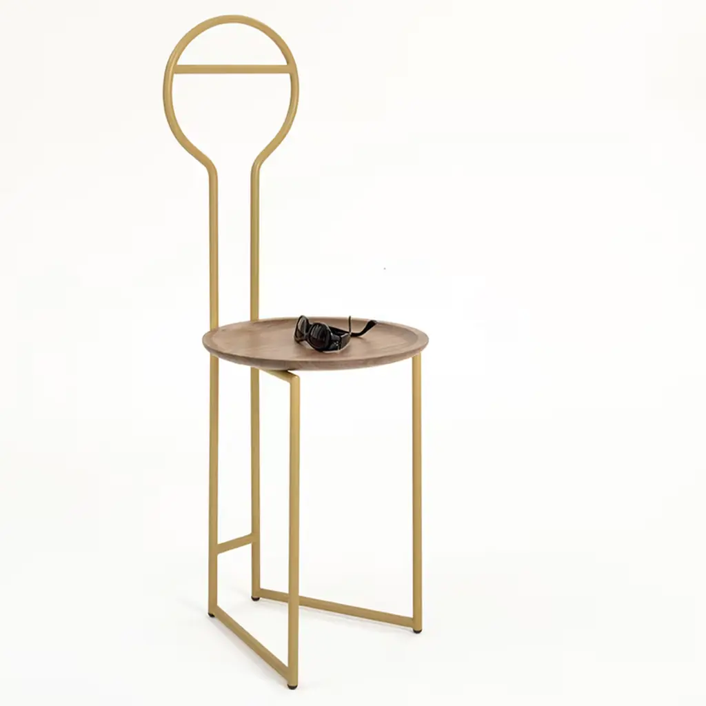 Chair, valet stand, and tray all at once, this exquisite design owes its name to the card games' jolly, which is famous for its passe-partout nature. Powder-coated in a golden hue, the openwork frame of tubular steel features two squared legs that support the round concave seat/tray in Canaletto walnut and the rounded coat/backrest with a straight, horizontal element connecting the sides to offer a further resting surface. A padded version of this piece is also available, please as the Concierge for options available.