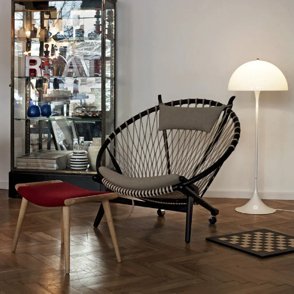 The PP Møbler PP130 Circle Chair represents a remarkable fusion of visionary design and practical luxury. Created by Hans J. Wegner and brought to life through PP Møbler's groundbreaking craftsmanship, this piece transforms the perfect geometry of a circle into a sanctuary of comfort that elevates any living space. The chair's seamless circular frame, crafted from solid ash using innovative lamination techniques, creates a striking silhouette that appears to float in space. Despite its substantial presence, the chair remains surprisingly light and mobile, allowing you to easily reposition it to create intimate reading nooks or dynamic conversation areas. The carefully tensioned flag line seating and backrest conform to your body, providing exceptional support while maintaining the chair's airy, transparent quality. Each Circle Chair is meticulously handcrafted to ensure both visual impact and lasting comfort. Available with your choice of stainless steel, brass, or black clips, every detail has been considered to maintain the pure geometric expression while adapting to your interior style. The result is a piece that commands attention without overwhelming its surroundings, creating a sophisticated focal point that invites both admiration and regular use. Perfect for contemporary homes and creative spaces, this masterpiece demonstrates how innovative design can enhance daily living. Whether placed in a prominent living room position or tucked into a private corner, the Circle Chair offers both a compelling artistic statement and a genuinely comfortable retreat for life's quiet moments. The clips are available in stainless steel, brass, and black. Please specify desired clip material when ordering.