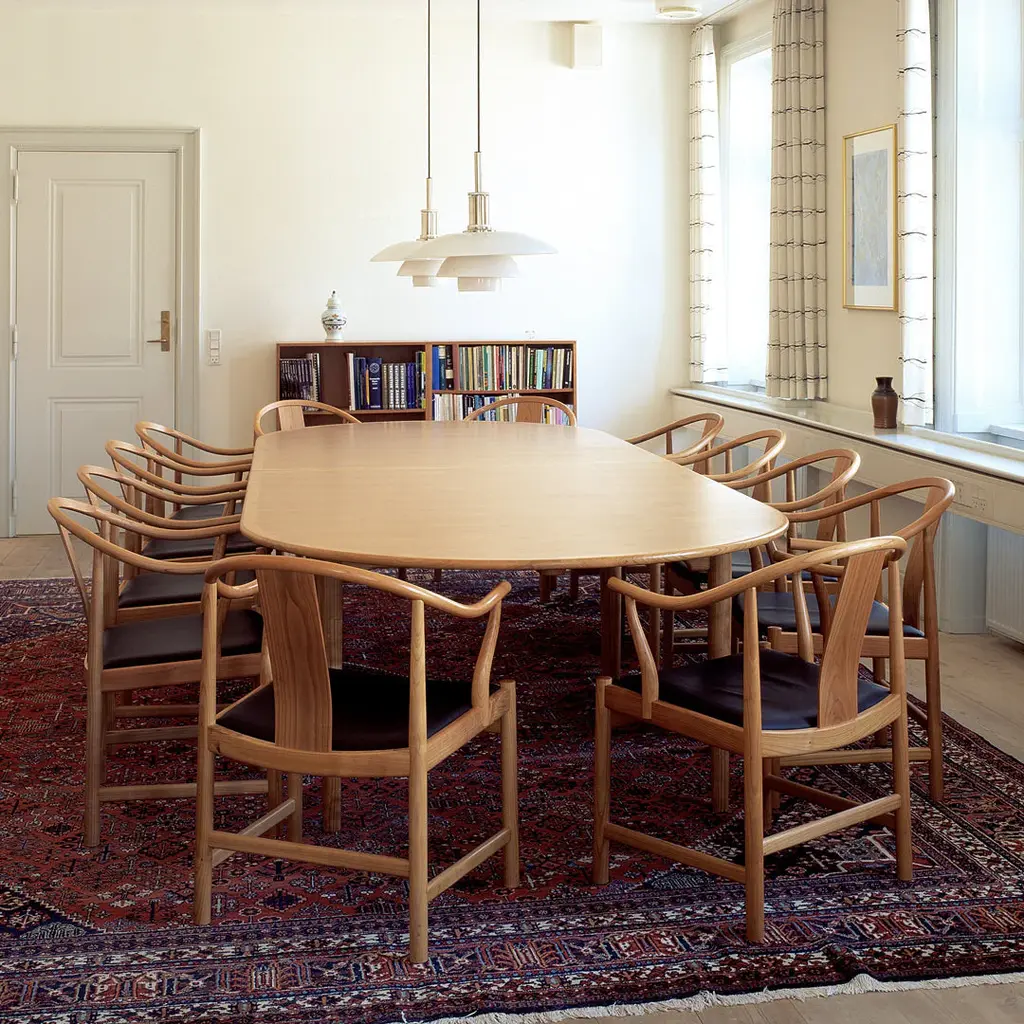 At the Cabinetmakers' Guild's Autumn Exhibition in 1943, Wegner presented his first version of a chair inspired by an old Chinese chair, which he had seen at the Danish Museum of Industrial Arts. Since then, more versions have appeared. The prototype for PP 56 was developed in cooperation with PP Møbler, and went into production in 1989. The Chinese Chair became a cornerstone for Wegner in his early line of designs inspired by foreign cultures. Completing at least seven individual prototypes of Chinese inspired chairs, Wegner worked intensely on modernising the traditional concept, and eventually The Chinese Chair evolved into the Round One, also called The Chair. pp66 was designed in 1945 and became the quintessential modern outcome of Wegner's studies of Chinese chairs. The pp56 version with the upholstered seat for a softer sitting experience was added in 1989. This chair has a high and comfortable back, an upholsered seat for a softer seat-ing experience which makes it very suitable for meeting rooms, and full length low armrests that fits well under-neath the table top.The center board is moulded with a bend high enough to offer proper support for the lower back. NOTE: This item is made to order by some of the world's best furniture craftsmen using materials that are required to meet PP Mobler's exacting specifications. As such, lead times can vary and are subject to change.