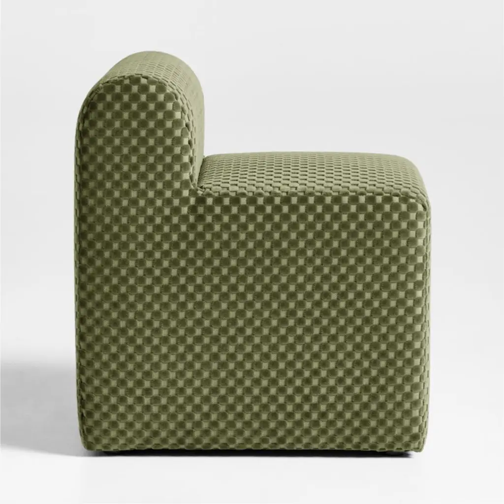 We had some fun reinventing a classic silhouette for kids' play spaces. The result? Our Wellie Slipper Chair. First, we shrunk the proportions to create a comfy, supportive seat at a just-right height for kids. Then we upholstered it in a luxe but playfuland thankfully, stain-resistantcheckered velvet. The chair's modern lines and moss green pattern have plenty of personality, but it's also subtle enough to slide gracefully into any room.