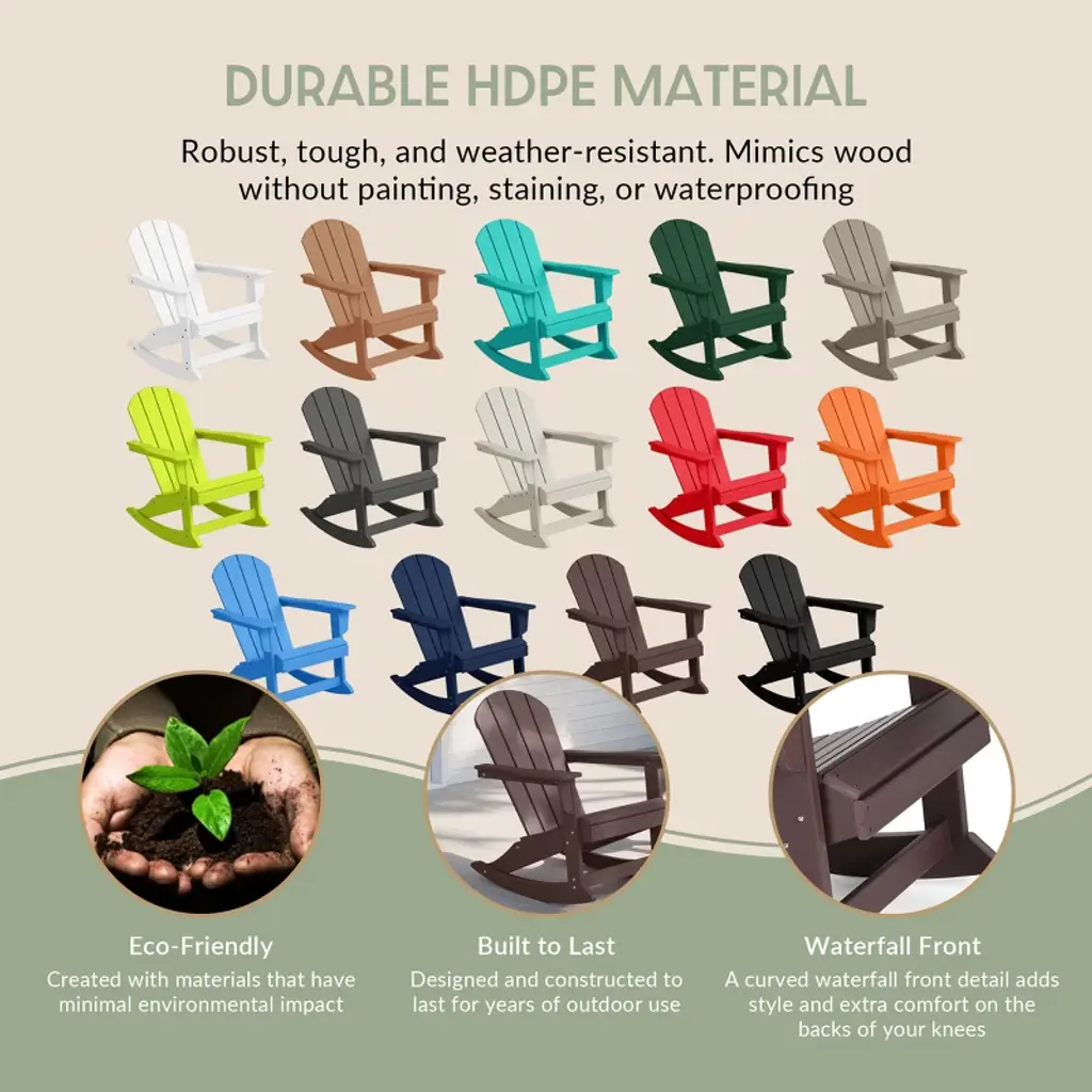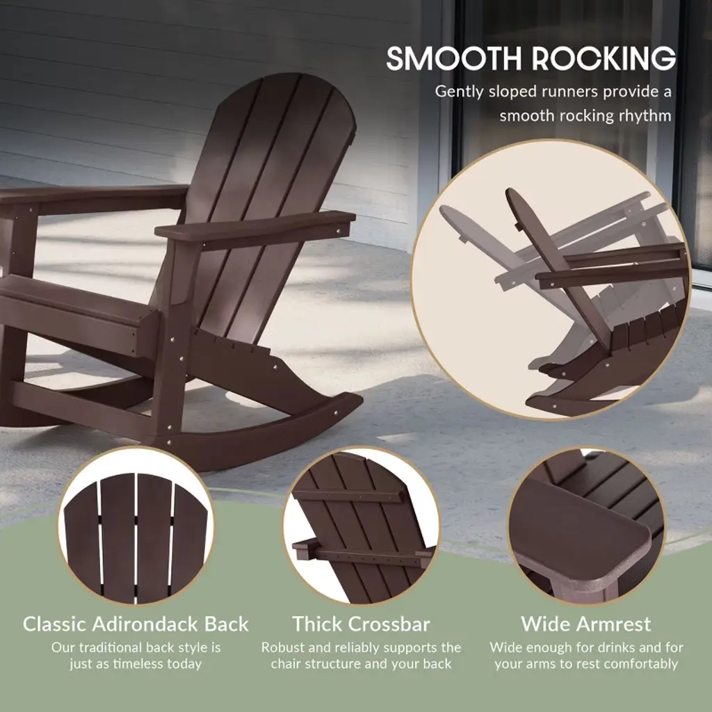 This is an ideal chair for unwinding in your backyard or porch on a sunny day while enjoying time with friends or family. You can relax all day long thanks to the chair's contoured design and wide armrests, which fit your body for a more comfortable experience. The smooth rocking base will have you wanting to stay in the chair all day long. The high-quality material is resilient to weather and UV rays, which allows them to withstand normal wear and tear so you can leave them outside all day without worrying about damage.While we strive to accurately represent product colors, please be aware that actual colors may vary slightly due to individual screen settings and lighting conditions. FeaturesContoured seat and wide arm rest offer all-day comfortThe chair's construction and high-quality (HDPE) material give it both strength and durabilityWeather and UV resistance avoids weather-related damageClassic Adironack design is perfect for a cabin or beach home lookMultiple color options to choose from for different settingsSimple to assembleDetails:Product Type: Patio Rocking ChairsWhat's Included: (1) Rocking ChairRocking ChairDimensions: 29.5" W x 33.25" D x 35" HWeight: 38.5 lbs.Seat Width: 20.25"Seat Depth: 20"Seat Height: 16"Weight Capacity: 450 lbs.