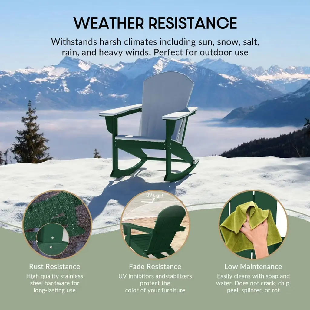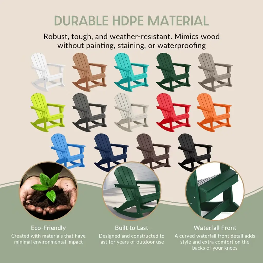 This is an ideal chair for unwinding in your backyard or porch on a sunny day while enjoying time with friends or family. You can relax all day long thanks to the chair's contoured design and wide armrests, which fit your body for a more comfortable experience. The smooth rocking base will have you wanting to stay in the chair all day long. The high-quality material is resilient to weather and UV rays, which allows them to withstand normal wear and tear so you can leave them outside all day without worrying about damage.While we strive to accurately represent product colors, please be aware that actual colors may vary slightly due to individual screen settings and lighting conditions. FeaturesContoured seat and wide arm rest offer all-day comfortThe chair's construction and high-quality (HDPE) material give it both strength and durabilityWeather and UV resistance avoids weather-related damageClassic Adironack design is perfect for a cabin or beach home lookMultiple color options to choose from for different settingsSimple to assembleDetails:Product Type: Patio Rocking ChairsWhat's Included: (1) Rocking ChairRocking ChairDimensions: 29.5" W x 33.25" D x 35" HWeight: 38.5 lbs.Seat Width: 20.25"Seat Depth: 20"Seat Height: 16"Weight Capacity: 450 lbs.