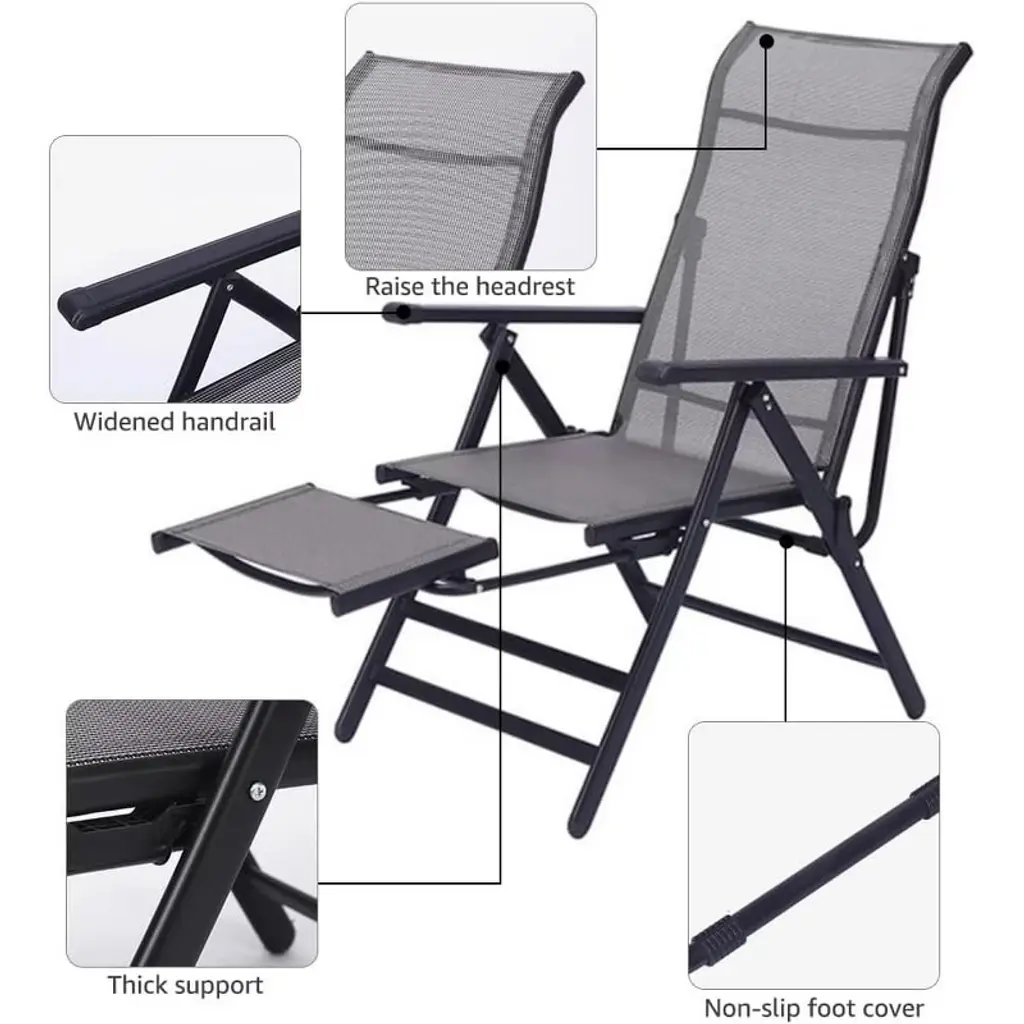 Upgrade your outdoor relaxation with our Luxury Foldable Garden Recliner. This high-quality recliner features a breathable mesh back and a comfortable cushioned seat, providing the perfect balance of support and ease. The adjustable headrest allows you to customize your comfort level, while the widened handrails offer additional support. Crafted with thick, durable materials, this recliner ensures stability and longevity. Its non-slip foot cover adds an extra layer of safety and comfort. The foldable design makes it easy to store when not in use, and the chair is perfect for patios, poolside lounging, or any outdoor setting. Indulge in the ultimate outdoor lounging experience with this stylish and functional recliner.