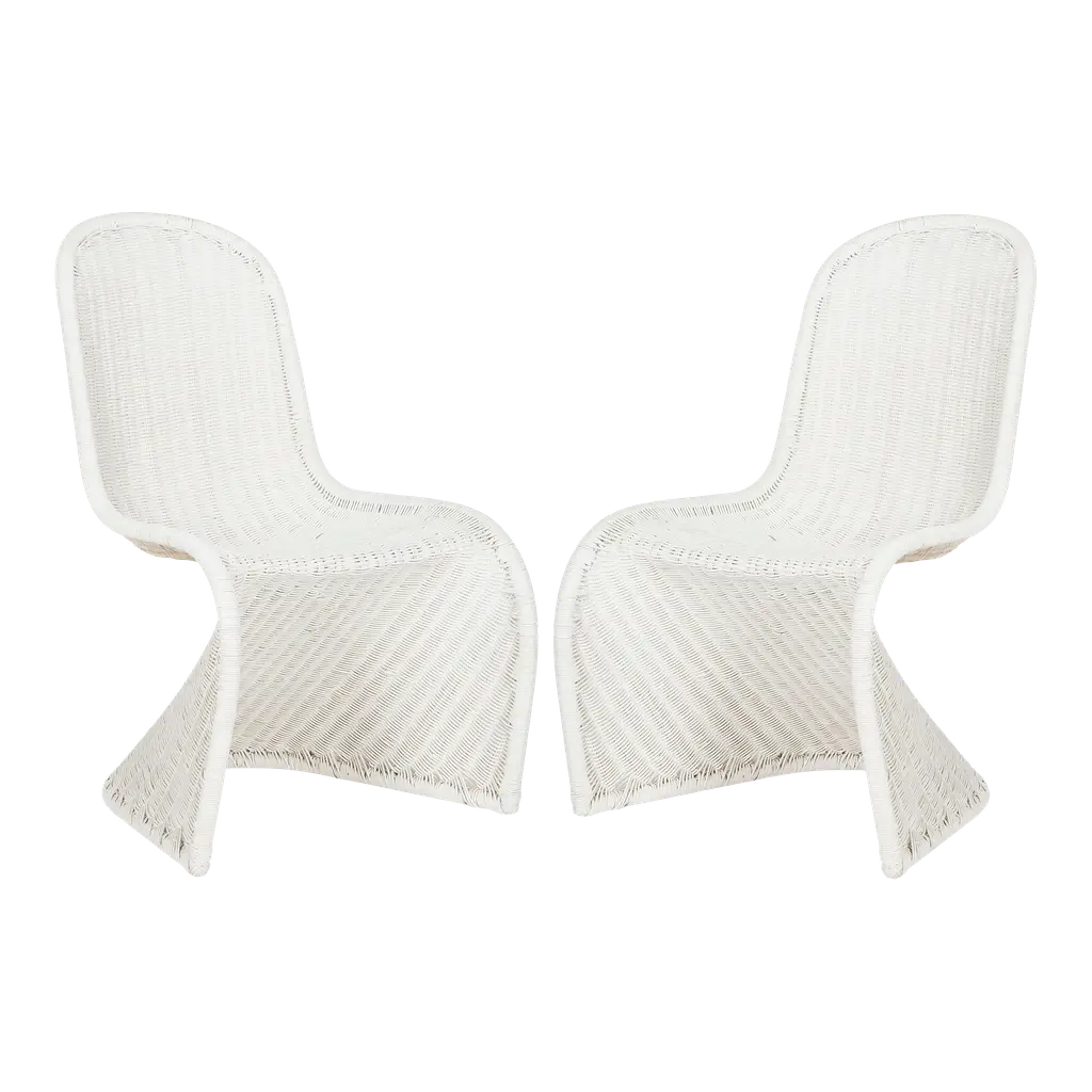 Postmodern sculptural 'Zest' chairs designed by French designer and artist Francois Liguori.The chairs are composed from woven rattan supported by a sculptural wrought iron frame. A charismatic design perhaps meant as more of a decorative item than a comfortable chair. There are two chairs available. Price is per chair. Dimensions (cm, approx):Height: 80 Width: 67Depth: 57