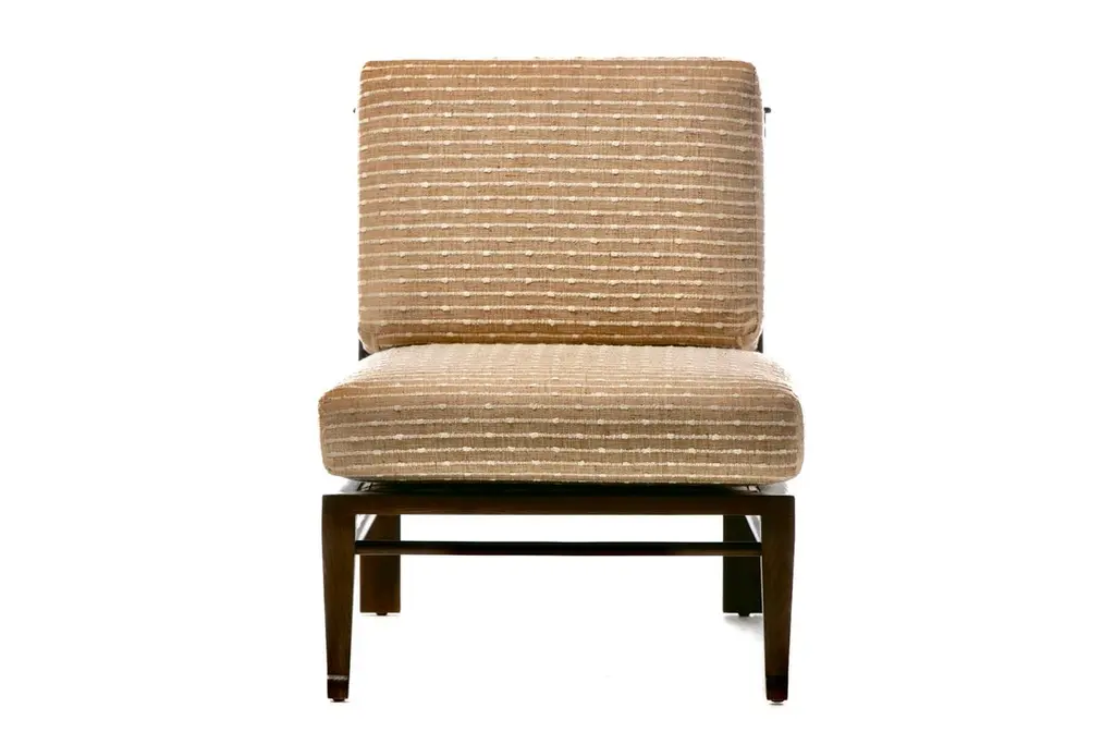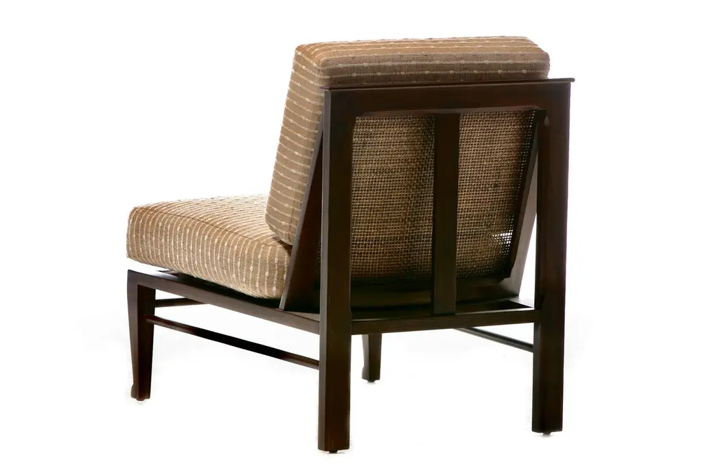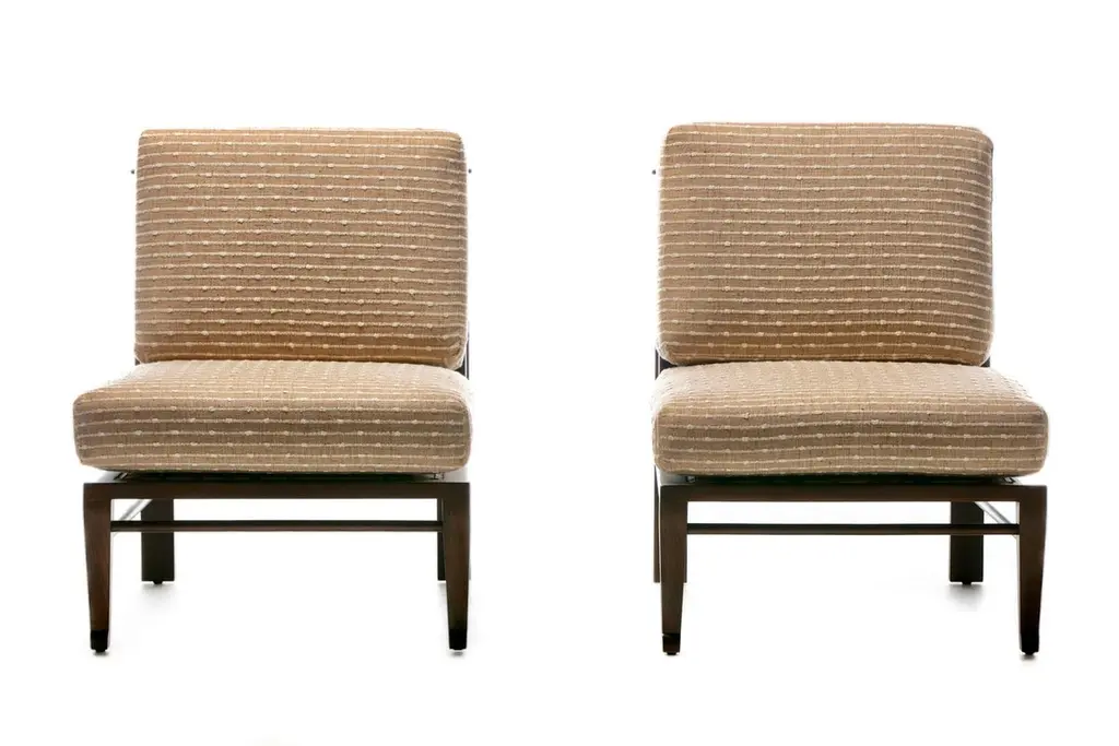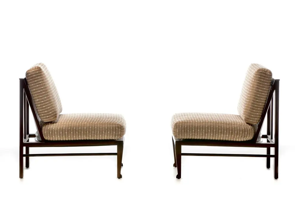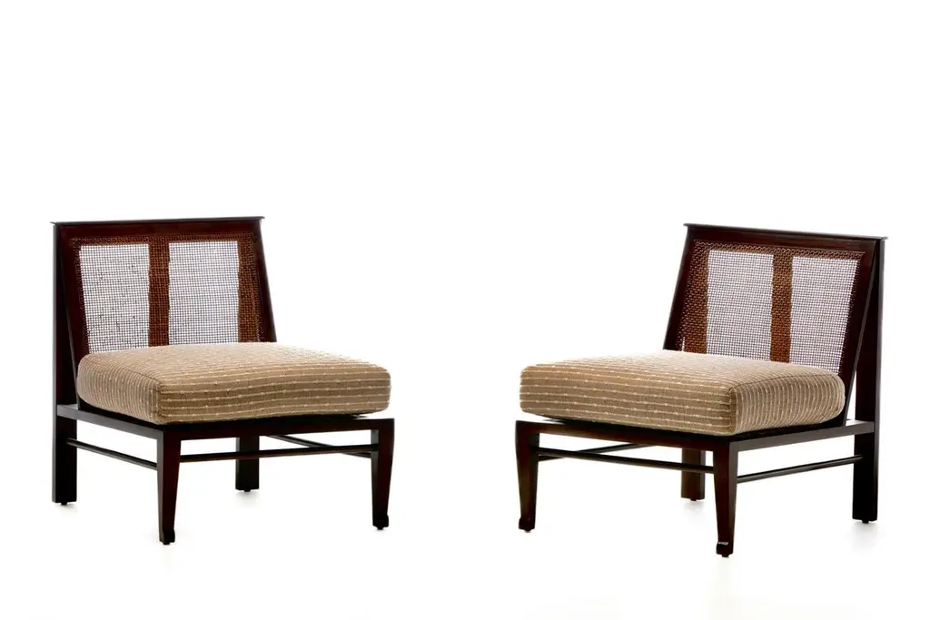 Rare pair of fully restored Mid Century Modern Thebes Chairs by William Pahlmann in new woven linen upholstery with minimalist linear design. Described as a "Design Legend" by Architectural Digest, William Pahlmann was inspired by ancient cultures and styles. He incorporated some of those ancient elements into mid century modern furniture. That eclectic mix made his pieces stand out from other mid century modern designs of the period. These Thebes chairs showcase Pahlmann's unique talent and merge modern mid century lines with Egyptian elements. Elegant. Affluent. Stately profile features clean mid century modern lines finished with Egyptian feet, an ancient style first enjoyed by Pharaohs. Comfortable wide seat and back cushions newly upholstered in linen. The back cushion is removable and reveals a cane back that's perfect for warmer climates. A wonderful acquisition for any collector of mid century modern pieces or aficionados of beautiful furniture. Want to see more beautiful things? Scroll down below and click "View All From Seller" or favorite our shop to get your 1stDibs on our new inventory.