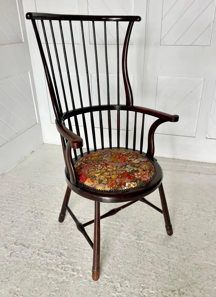Arts & Crafts barrel back Windsor style chair in stained beechRe-upholstered in original Liberty fabric ‘Cottage Garden’Circa 1895 Height 103cm. Width 56cm. Depth 50cm