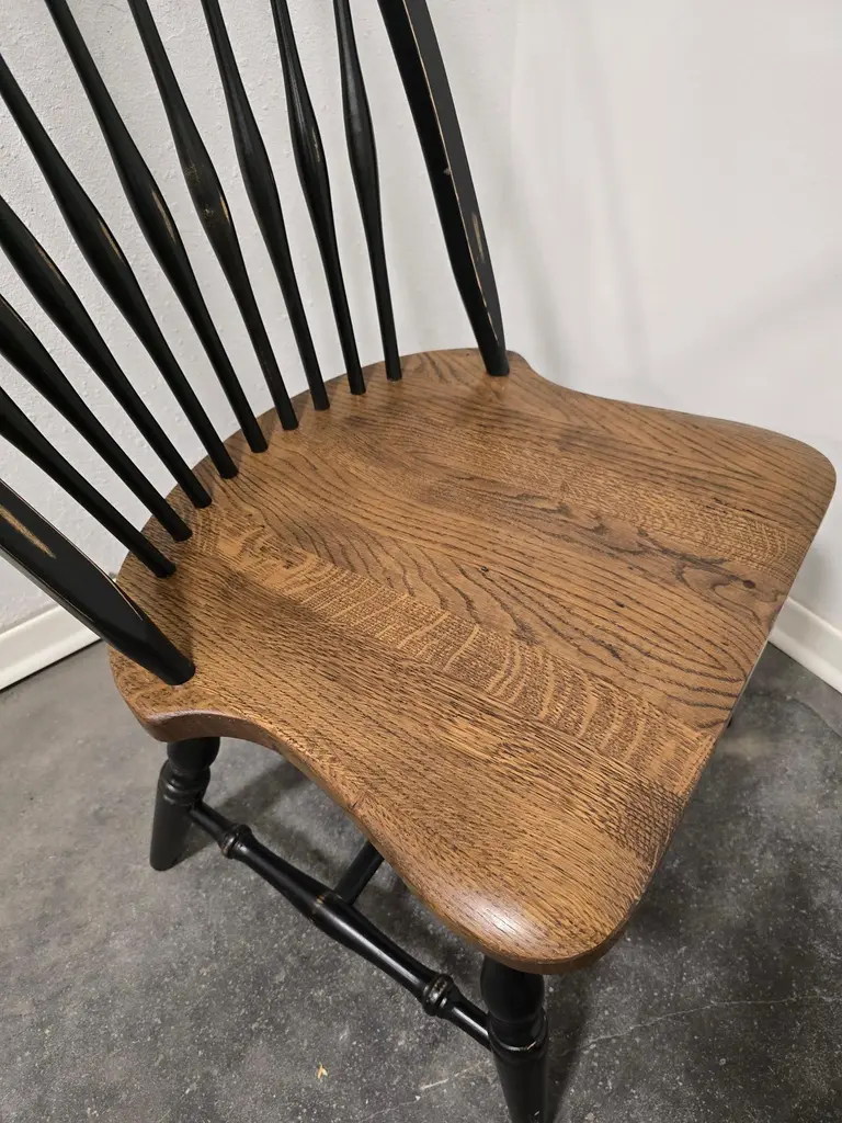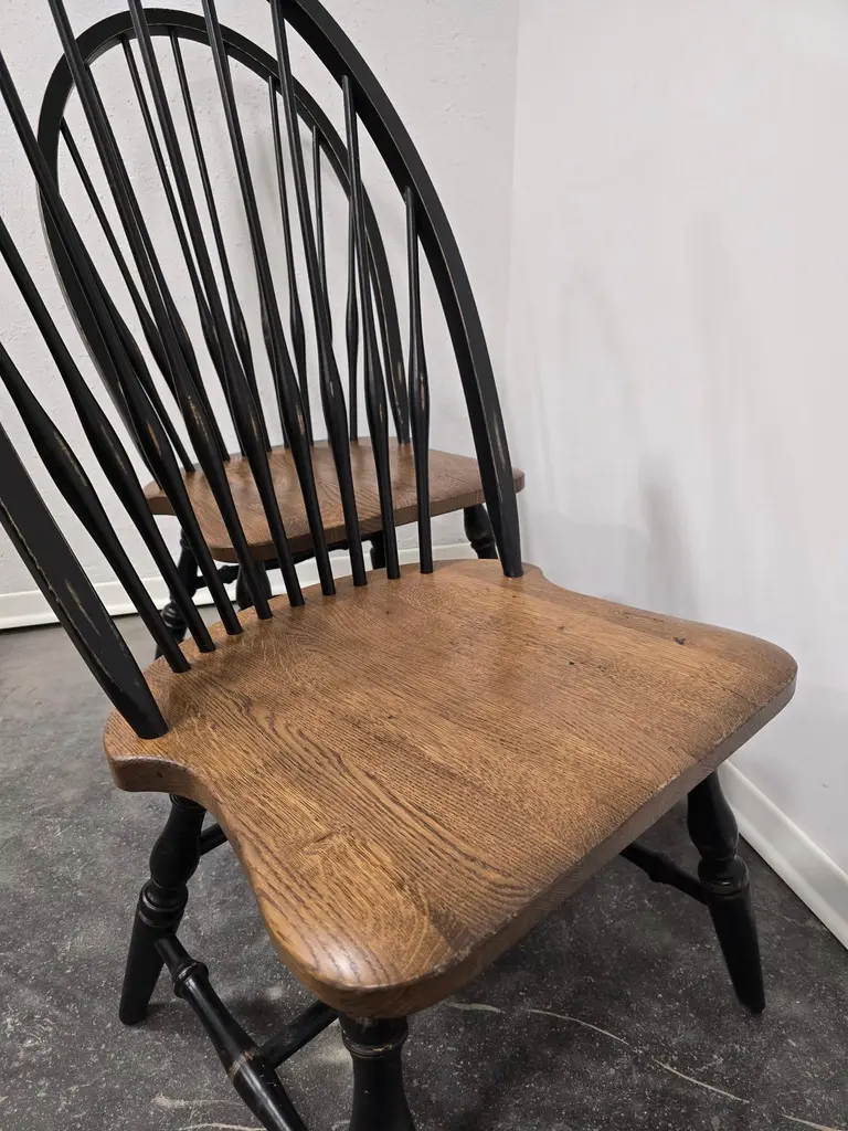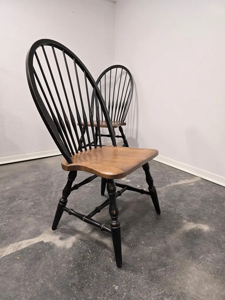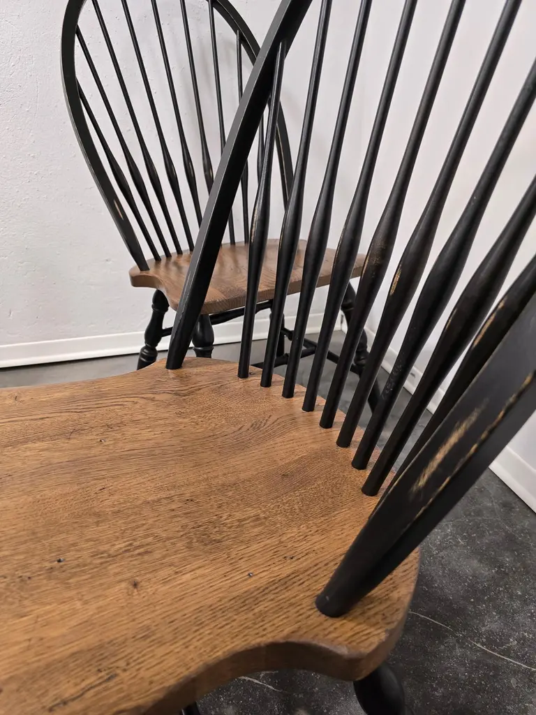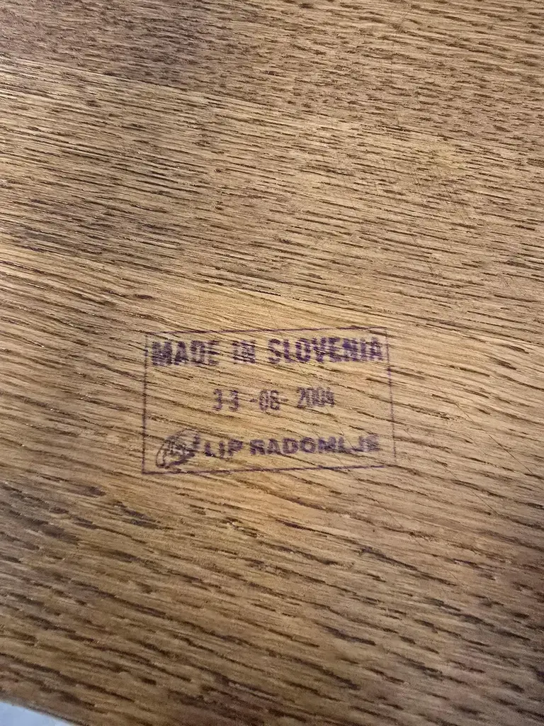 Windsor-style chair from 2004, made in Slovenia by Lip Radomlje (labeled). These chairs are truly beautiful and sturdy, a high-quality piece made from oak wood. The chairs age beautifully, with a beautiful patina. The price is for one chair.