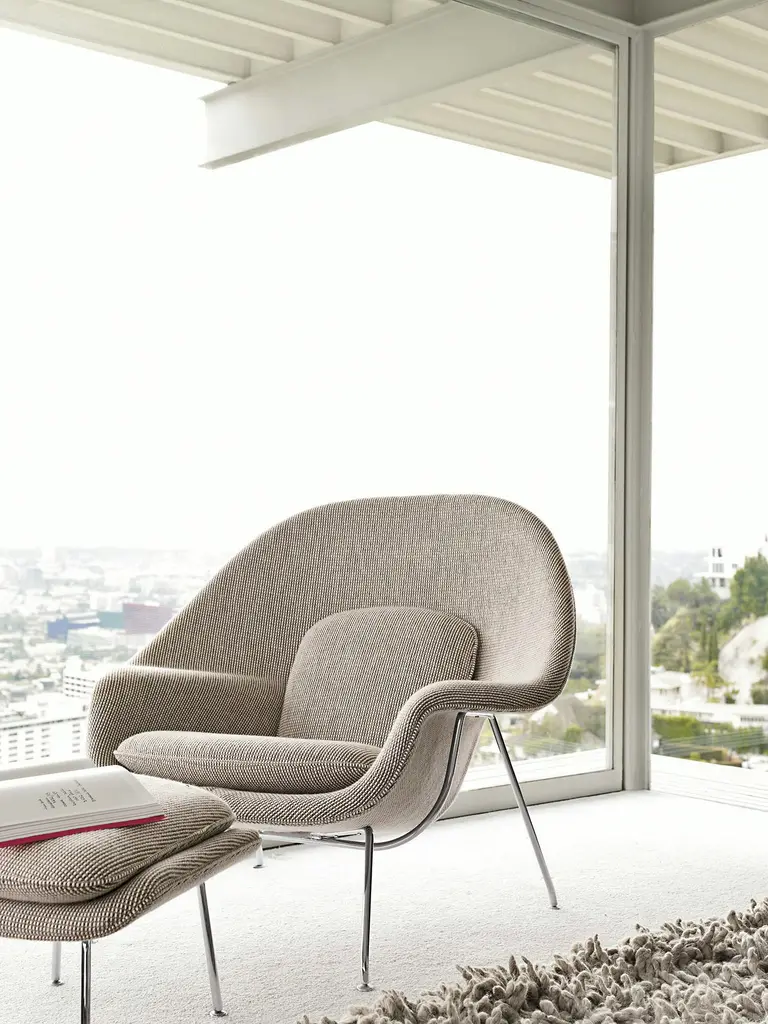 The expressive sculptural forms of the Eero Saarinen Womb Chair (1946) can also be found in his architecture, from the TWA Terminal (now the TWA Hotel) at New York's JFK Airport to the Gateway Arch in St. Louis. In 1940, the Finnish American and his friend Charles Eames took first prize at the Organic Design in Home Furnishings competition at MoMA. Later that decade, Florence Knoll challenged Saarinen to create a chair that she could curl up in, which led to this iconic design. The Knoll Womb Chair has an enveloping form that continues to be one of the most celebrated and recognized representations of midcentury organic modernism. By applying foam molded over a fiberglass shell, Saarinen created a single-piece form that perfectly facilitates a relaxed sitting posture. Manufactured by Knoll according to the original specifications of the designer.