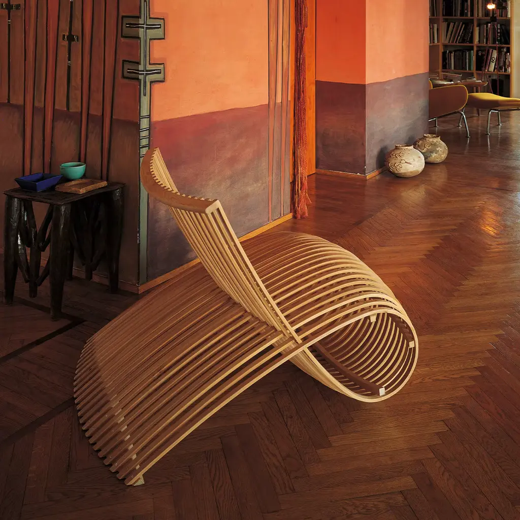 First designed in 1992 by Marc Newson, this chair expresses the artist's daring and innovative desire to push wood craftsmanship to its limits. Modern and unique but also warm and comfortable, it features a sleek and continuous shape resting on a structure made of oiled natural solid ash wood, completed with beech wood planks masterfully bent with hot steam to form double curves, finally supported with two horizontal slabs fastened with a visible screw.