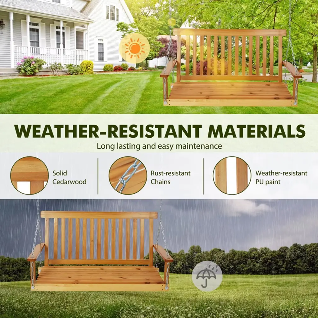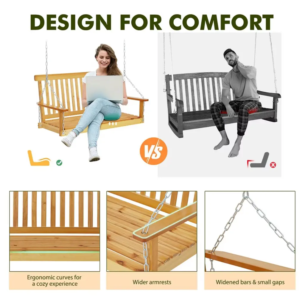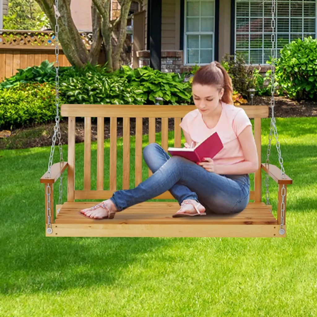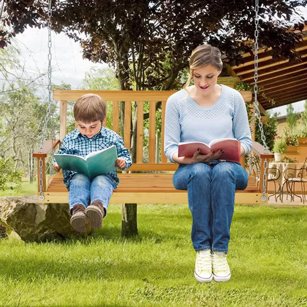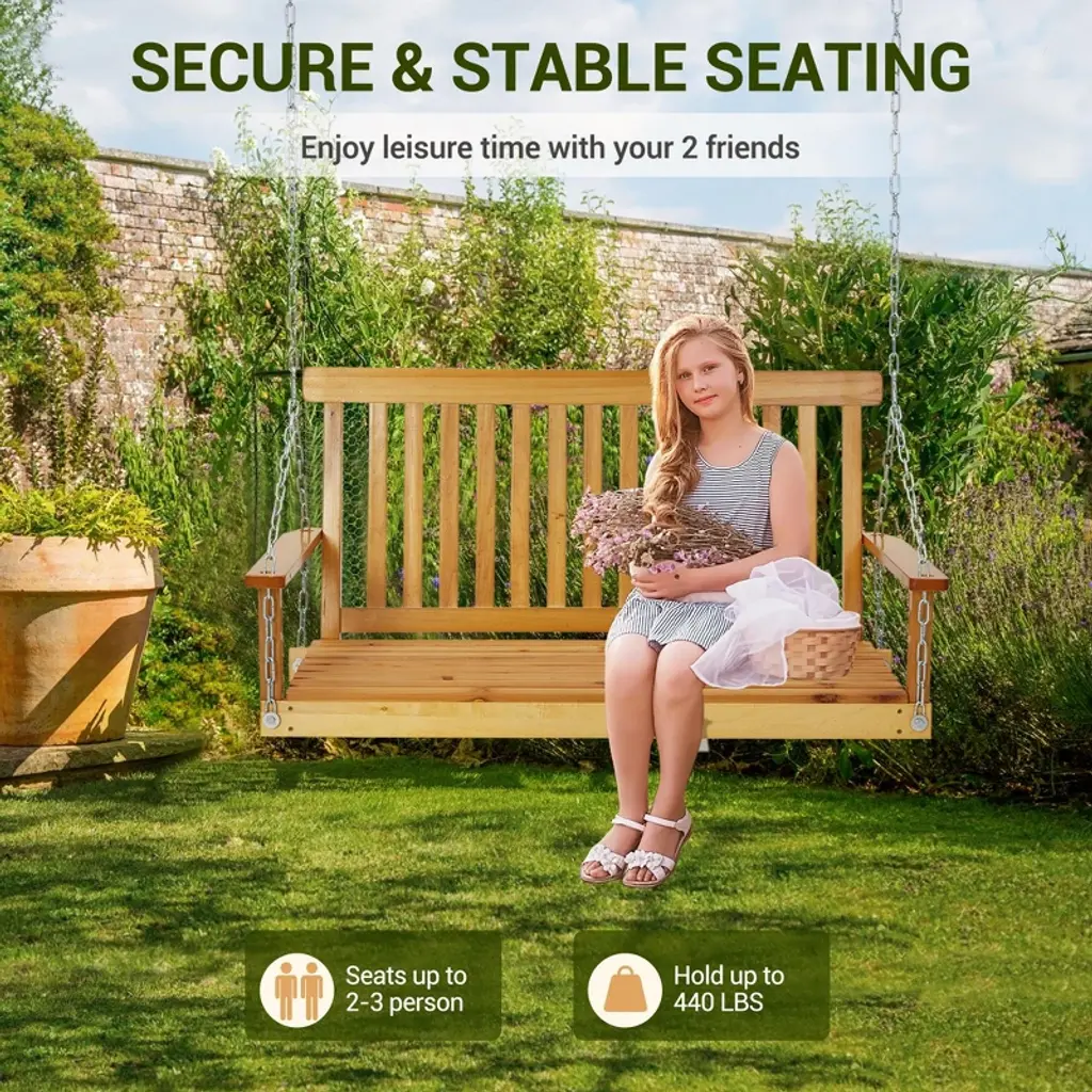4FT Wooden Porch Swing Bench Looking for a relaxing spot to enjoy quiet mornings or cheerful evenings with loved ones? Imagine adding a charming wooden swing to your backyard—how would it transform your outdoor living experience? Highlights at a Glance: Wide ergonomic seat for 2-3 peopleWeatherproof PU-coated fir woodAdjustable rust-resistant chainsSupports up to 440 lbsClassic wooden style for any outdoor space Specification:Product Dimension: 47.2x24.8x23.6 inchesWeight capacity: 440 lbsColor: Natural Wood ColorMaterial: Fir Wood+Iron Packing List:1 x Wooden Swing Bench1 x Instruction Manual1 x Accessory Kit Packing List:For outdoor use, install the swing on a strong, stable support structure.Adult assembly required; ensure all bolts and chains are securely fastened before use.Periodically check and tighten hardware to maintain safety and stability.Children should use the swing under adult supervision at all times.