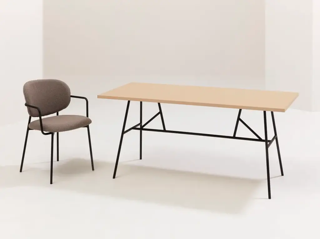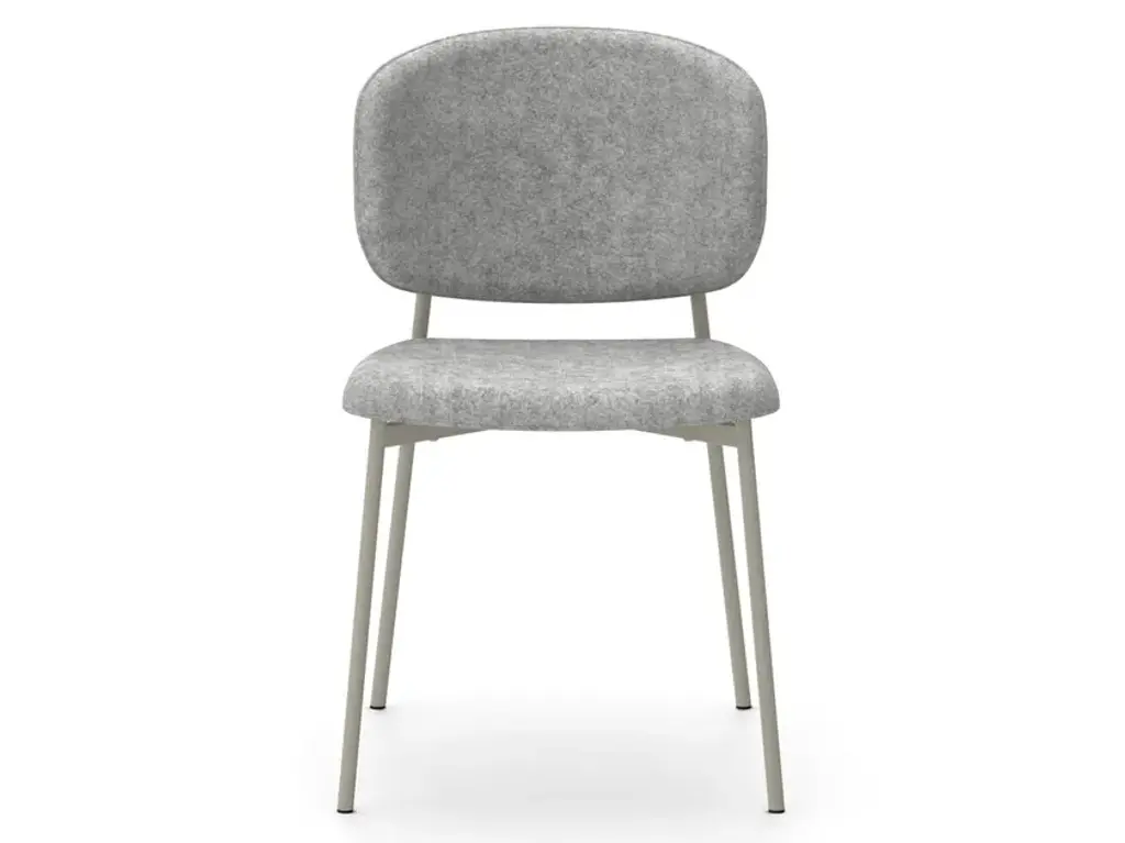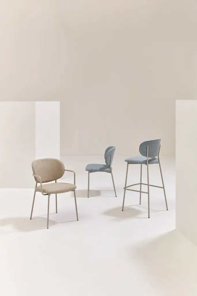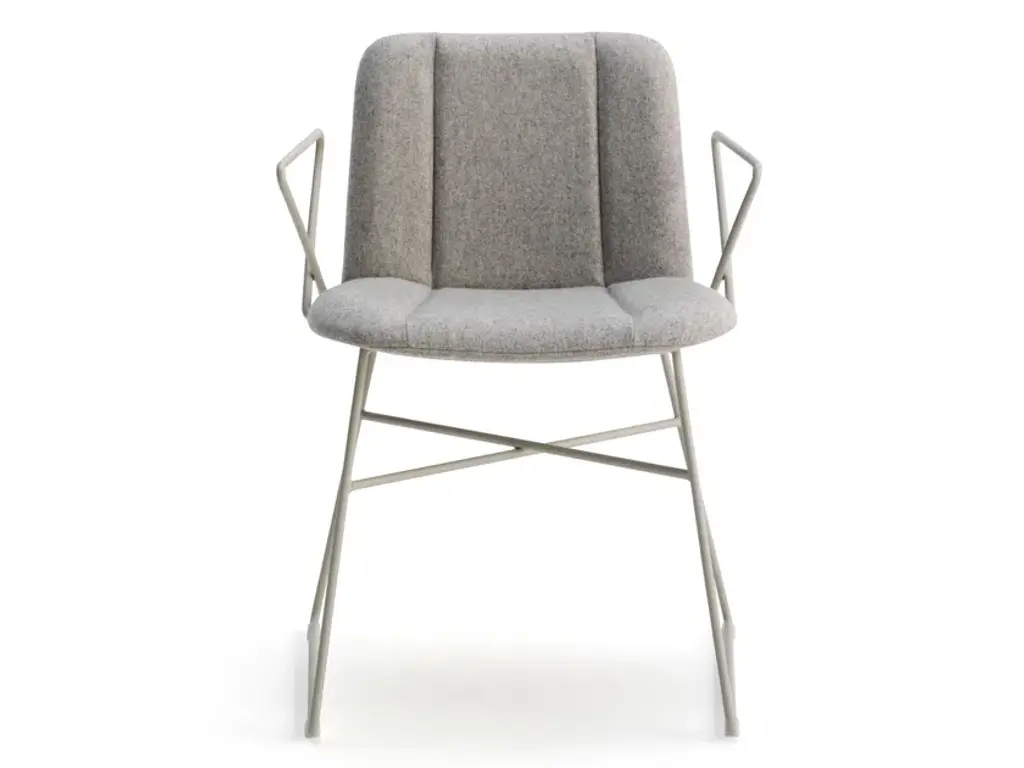 Wround 6C82 is a chair with armrests, featuring a steel frame and upholstered seat and backrest.Wround is a collection characterized by a steel rod frame that supports a seat and backrest with welcoming proportions.This concept is expressed in various versions—from chairs to armchairs, stools to lounge seats—to meet the needs of social spaces that require lightweight, customizable seating coordinated for different areas.