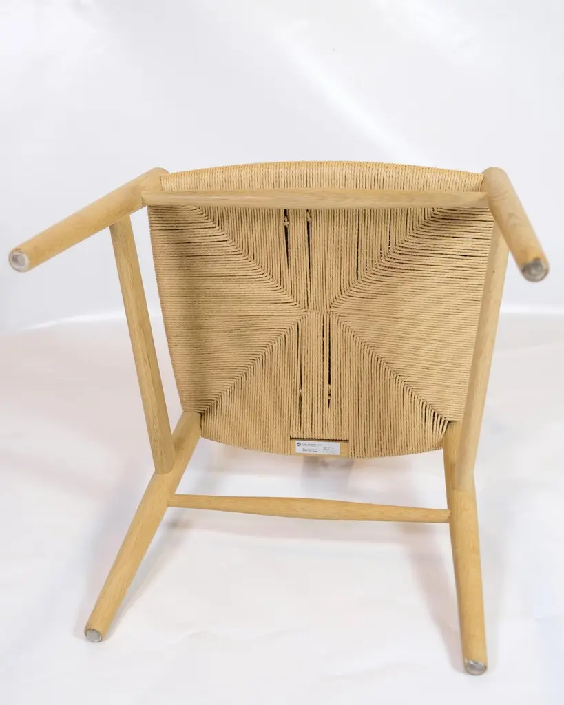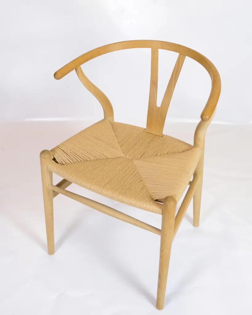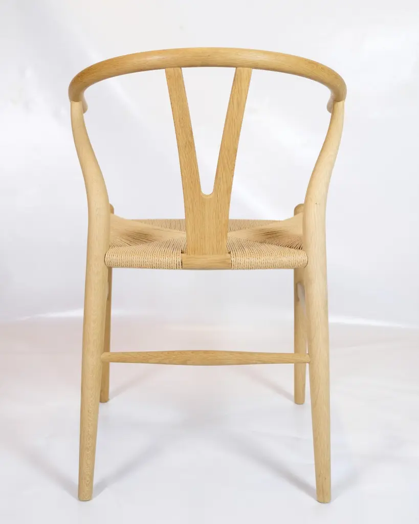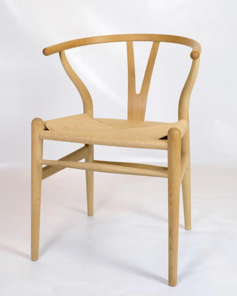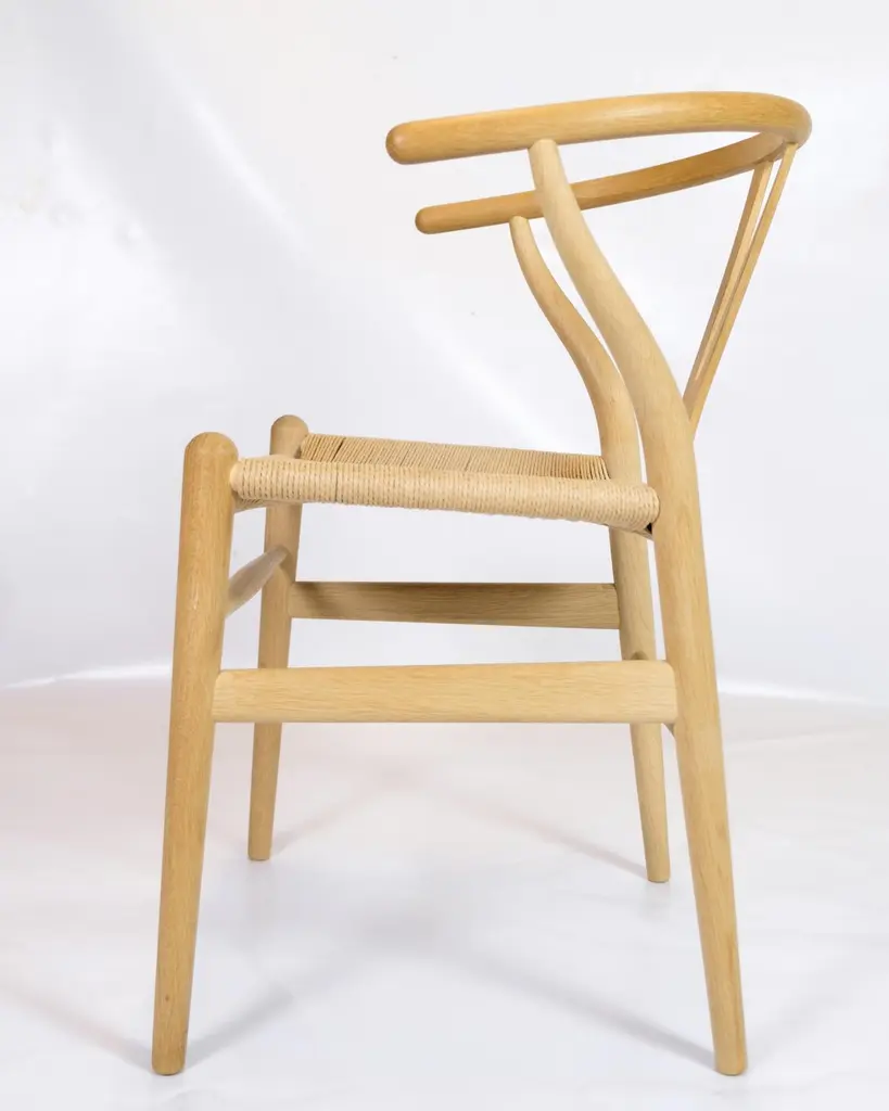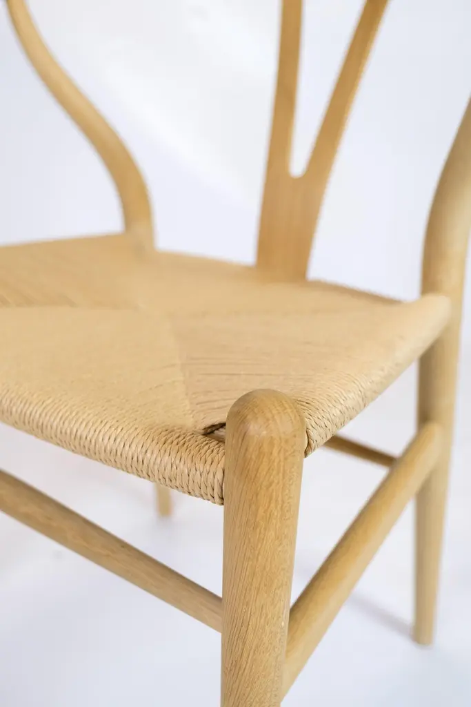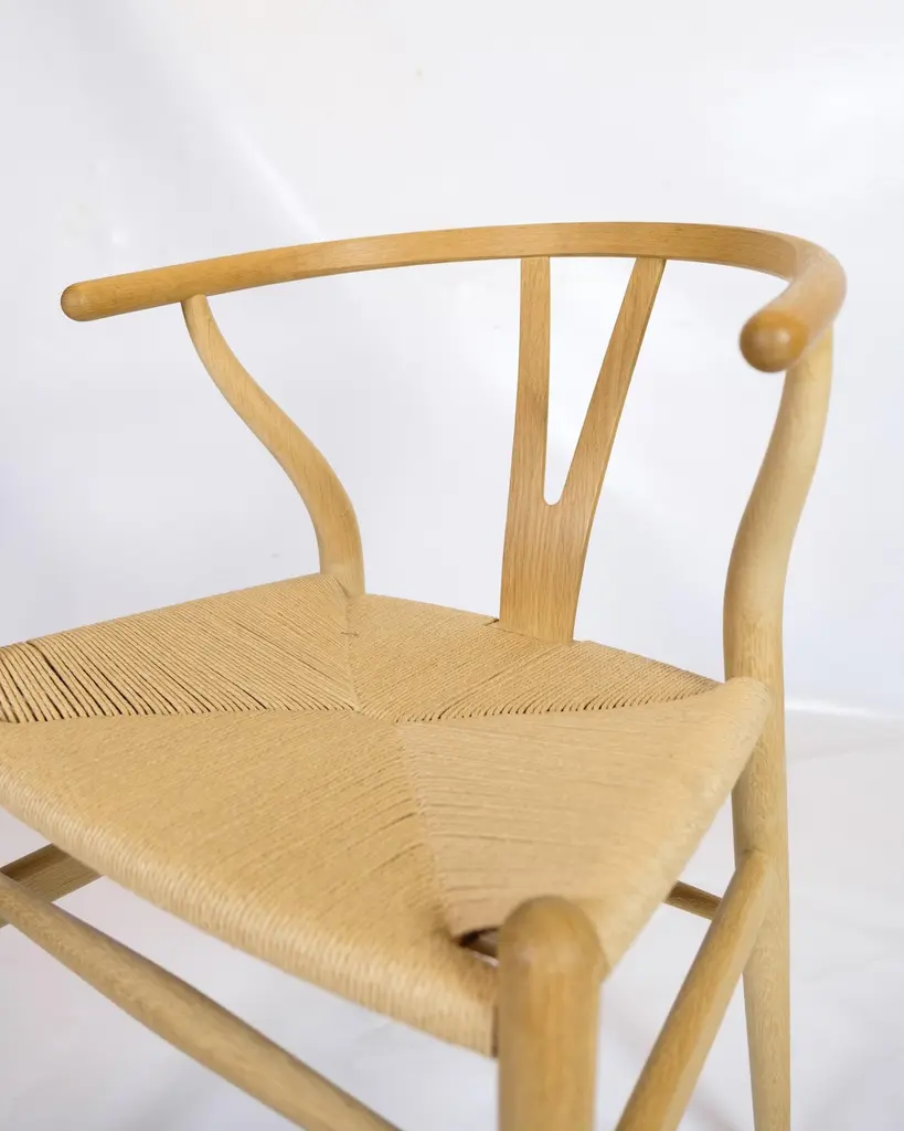 The Y chair, also known as model CH24, in light oak, designed by the legendary Danish furniture architect Hans J. Wegner in 1950.A true icon of modern furniture design, the Y chair has been regarded as a masterpiece of form and function. The elegant curved back and the characteristic Y-shaped design give the chair a unique and timeless aesthetic that fits perfectly with any decor.The light oak adds warmth and brightness to the room, while highlighting the chair's beautiful craftsmanship and quality. Wegner's skill in creating comfortable and ergonomic furniture shines through in the design of the Y chair, which offers a comfortable sitting experience for a long time.With the Y chair, you don't just get a piece of furniture, but a work of art of Danish design heritage that will adorn your home or office for many years to come. It is a symbol of Wegner's genius and dedication to creating furniture of exceptional beauty and functionality.We have 8 chairs in stock.Dimensions: H:76cm W:49cm D:42.5cm SH:45cm