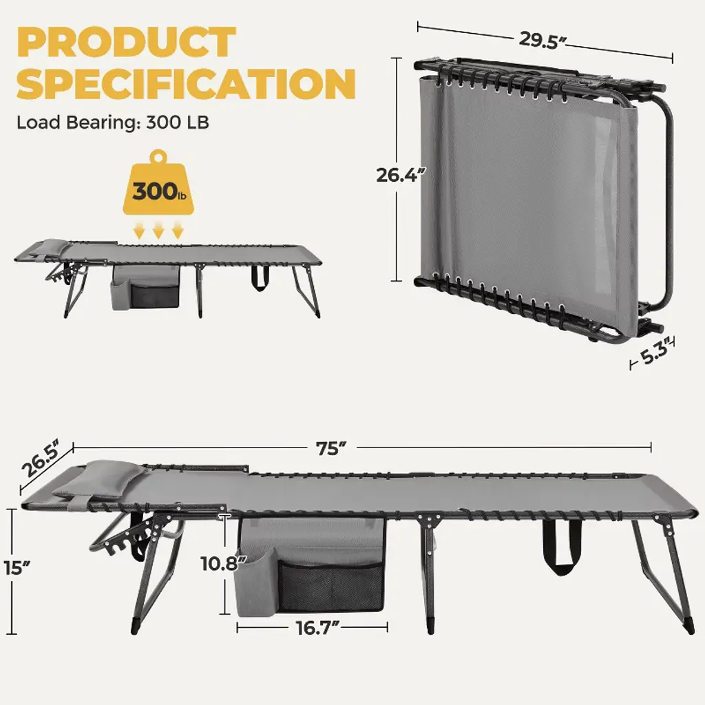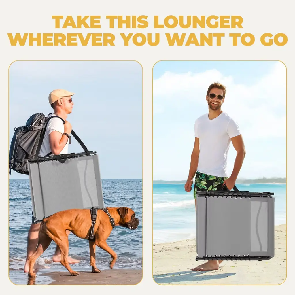 Relaxation just got easier with this adjustable outdoor bed. Featuring five back positions from 136° to 180°, it’s designed for everything from lazy sunbathing to catching up on a good book. Its generous size gives you plenty of room to stretch out. Built with resilient 550g Textiline fabric, it stands up to outdoor wear. With a stable three-leg frame supporting up to 136 kg / 300 lb, it’s ready to travel—folds compactly, and is easy to carry wherever you go. * Specifications: Color: Gray Materials: 550g Texteline, Iron Assembled Dimension: 66-74.5" L × 26.5" W × 32.5-15" HAdjustable Angle Range: 138° to 180°Folded: 29.5" L × 26.4" W × 5.3" HMaximum Weight Capacity: 300 lbAssembled Weight: 15.2 lb Shipping Weight: 18.3 lbPlease see the image for exact measurements.Please allow ± 0.6" measurement tolerance.