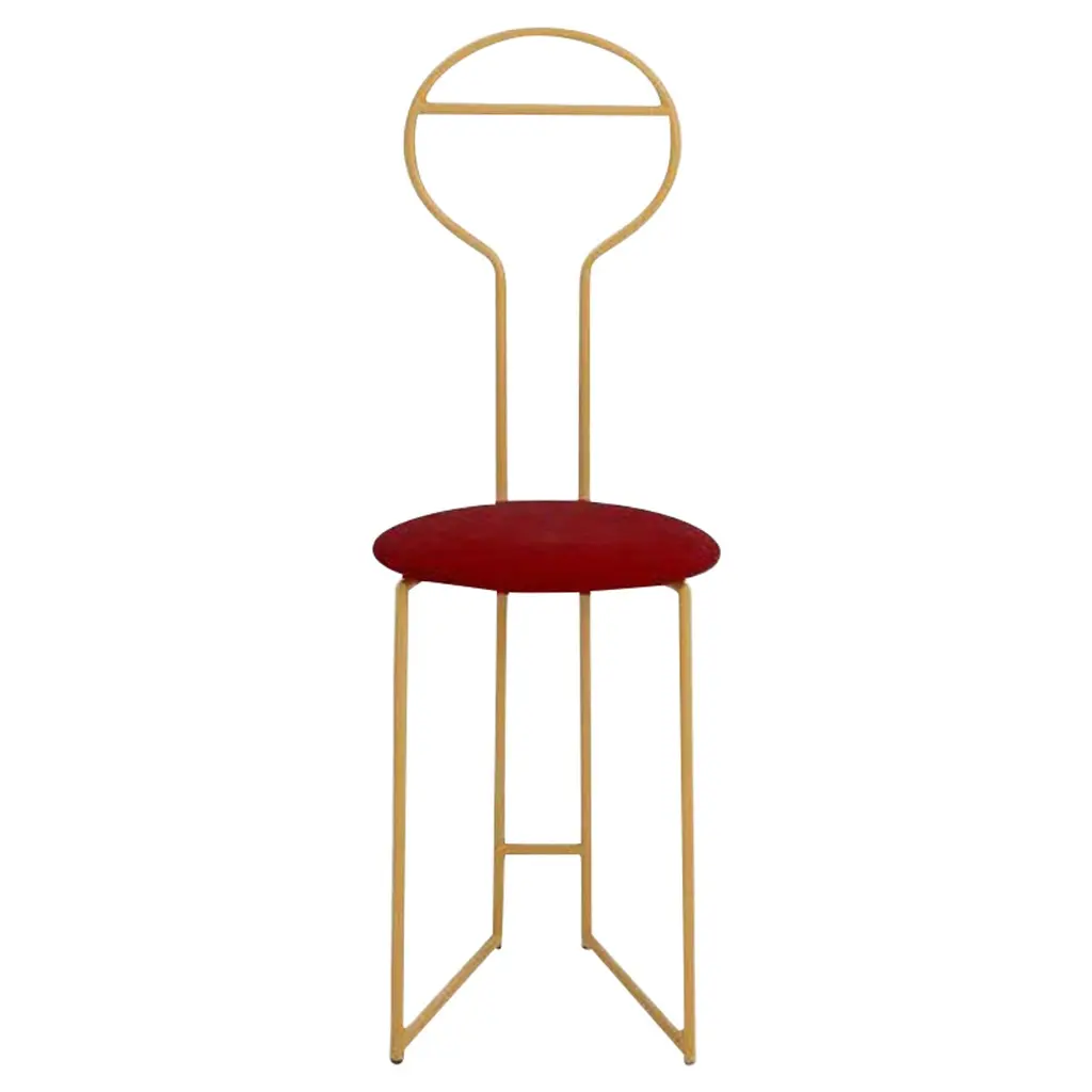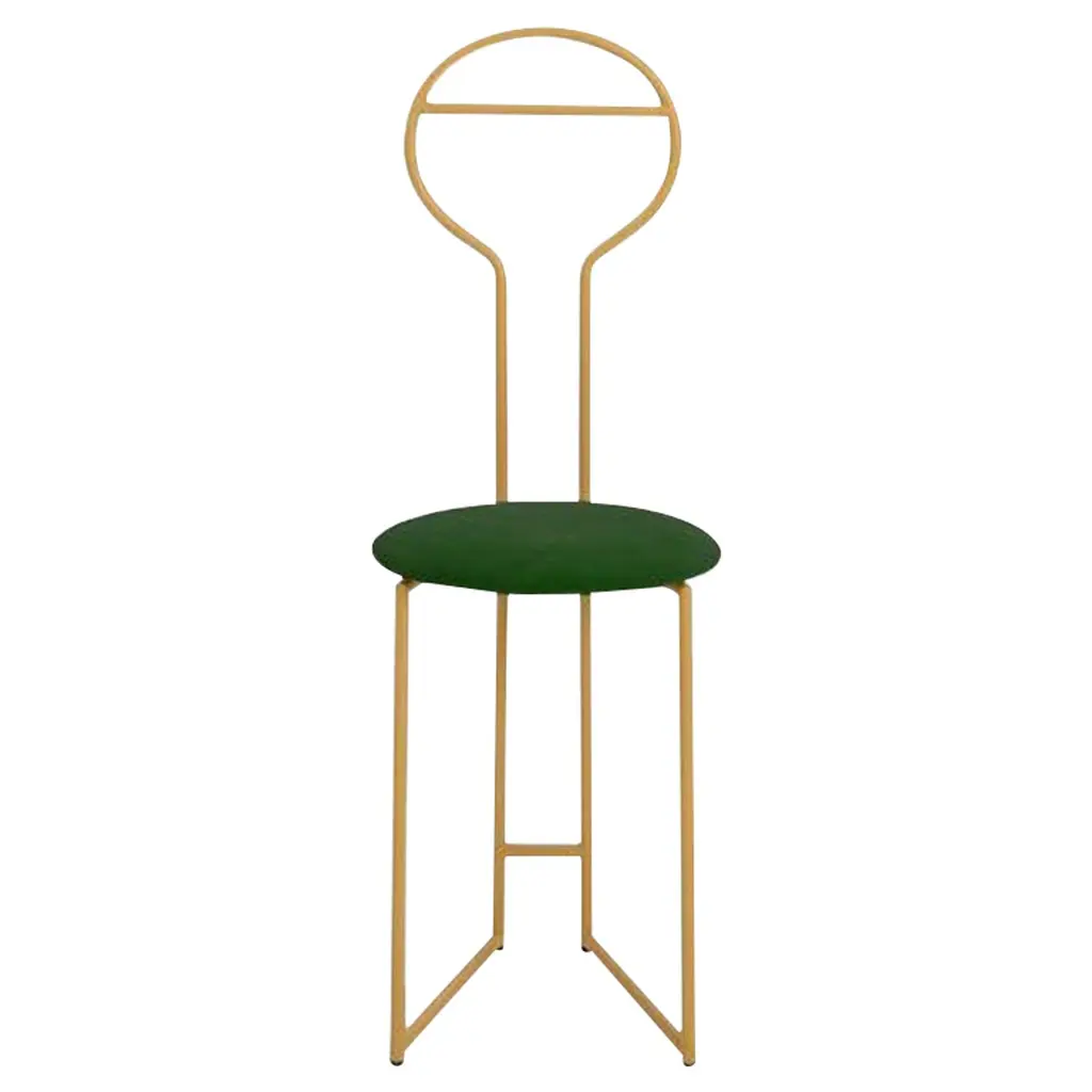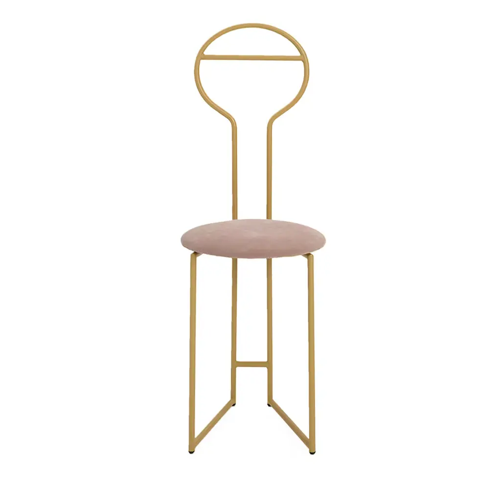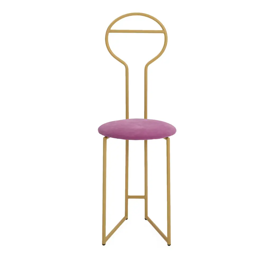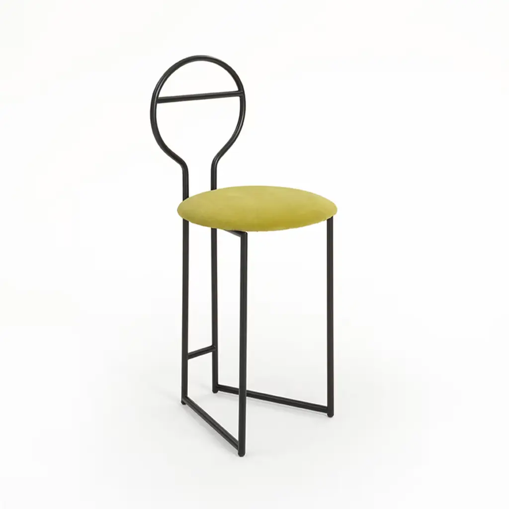 Showcasing a streamlined, openwork structure in tubular steel powder-coated in black, this intriguing design is simultaneously a seat and a valet stand. Its versatile nature is hinted at by its name, reminiscent of the jolly's polyhedral role in card games. The rounded backrest, equipped with a horizontal element providing further support, matches the circular shape of the seat that is padded and upholstered with vibrant mustard yellow velvet. Please ask the Concierge for customization options and to request the version with a seat in solid Canaletto walnut.