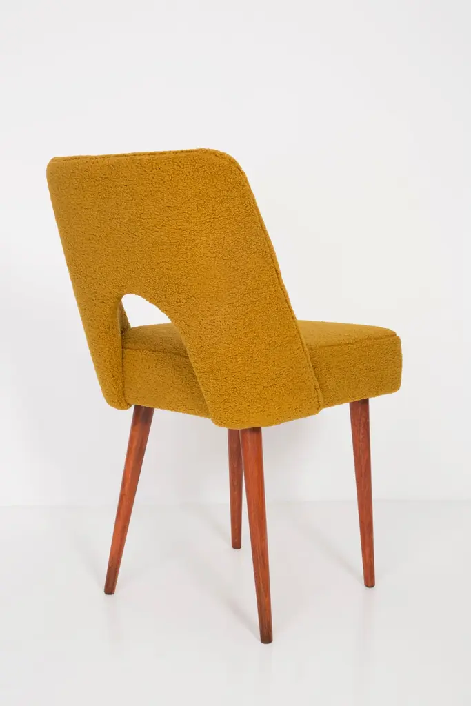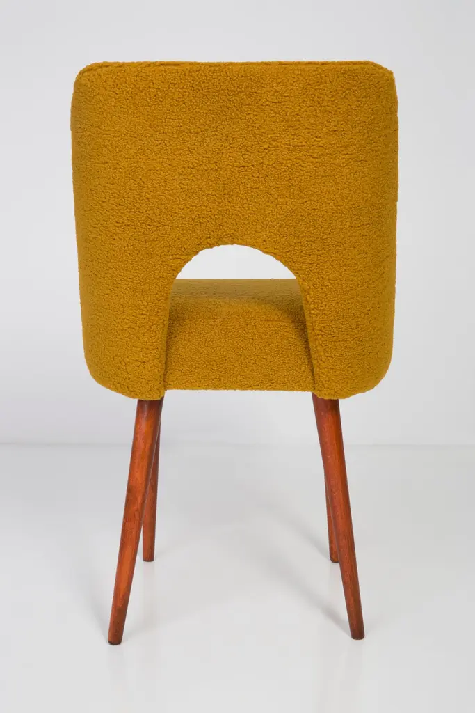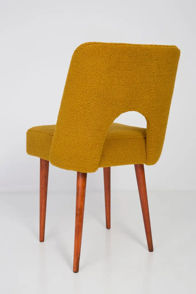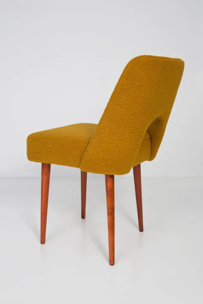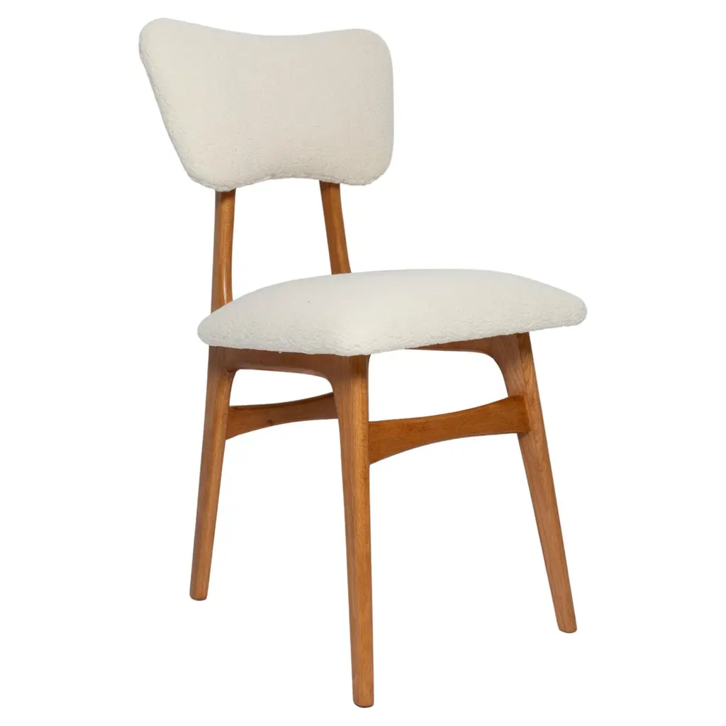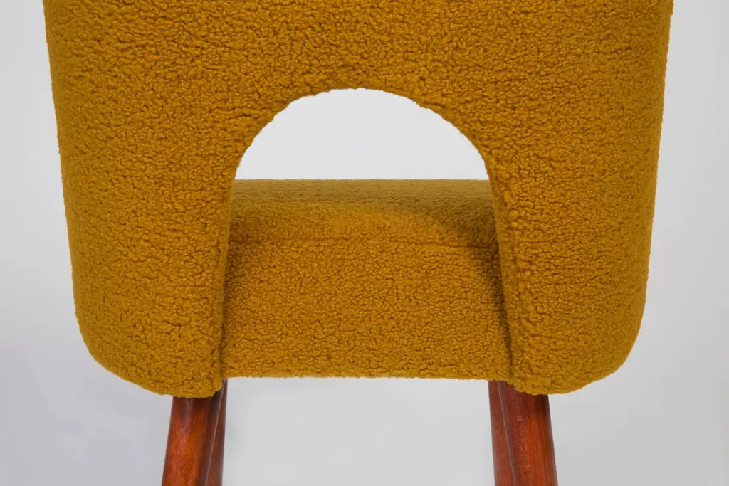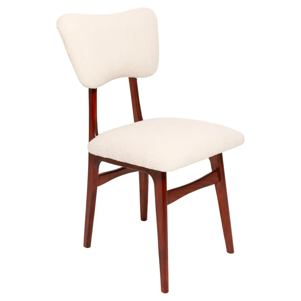 Beautiful chair type 1020 colloquially called "shell" produced by the Slupsk centre of furniture industry in the 1960s in Poland. They are after full renovation upholstery and carpentry. Seat and back is dressed in crème, durable and pleasant to the touch bouclé fabric. We can prepare this chair in every color of wood and fabric also in bigger sets. Please check the last picture with bouclé and wood color samples.