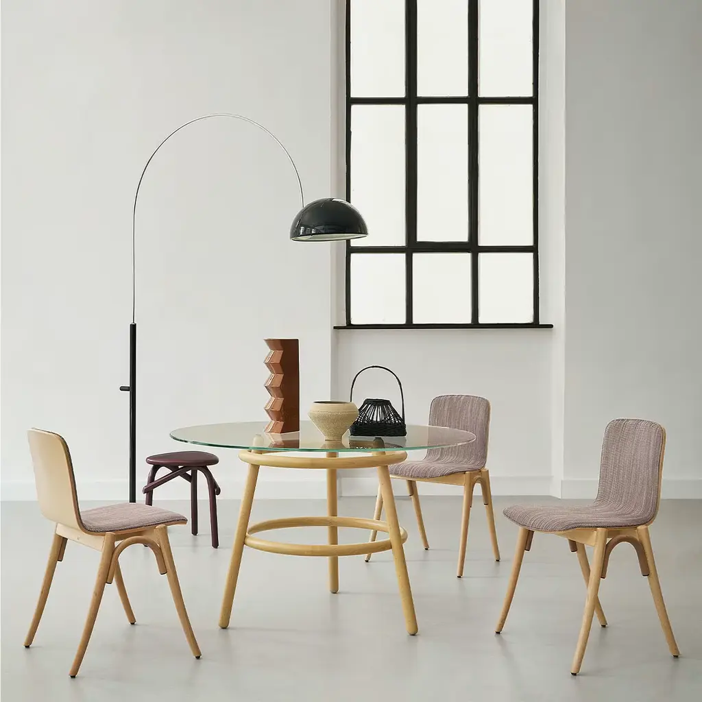The YOU stackable chair, designed by LucidiPevere in 2024, embodies the minimalist design that defines Gebrüder Thonet Vienna GmbH (GTV). A symbol of versatility, its elegantly curved solid arch not only enhances the side profile but also ensures stability when stacked, with protective rubber pads at the ends. The beech frame supports a shell available in natural or colored finishes, with optional padding, offering endless possibilities for playful customization.