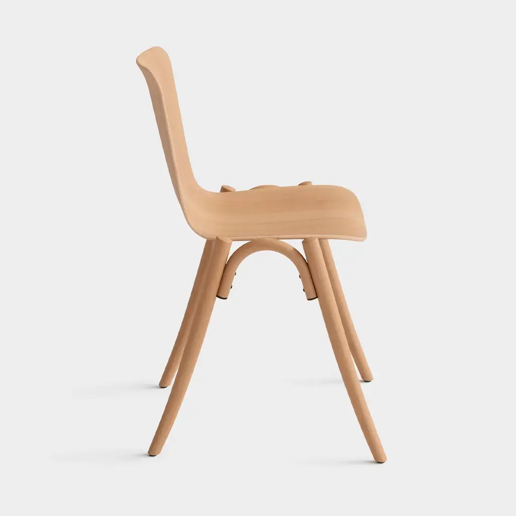 The YOU stackable chair, designed by LucidiPevere in 2024, embodies the minimalist design that defines Gebrüder Thonet Vienna GmbH (GTV). A symbol of versatility, its elegantly curved solid arch not only enhances the side profile but also ensures stability when stacked, with protective rubber pads at the ends. The beech frame supports a shell available in natural or colored finishes, with optional padding, offering endless possibilities for playful customization.
