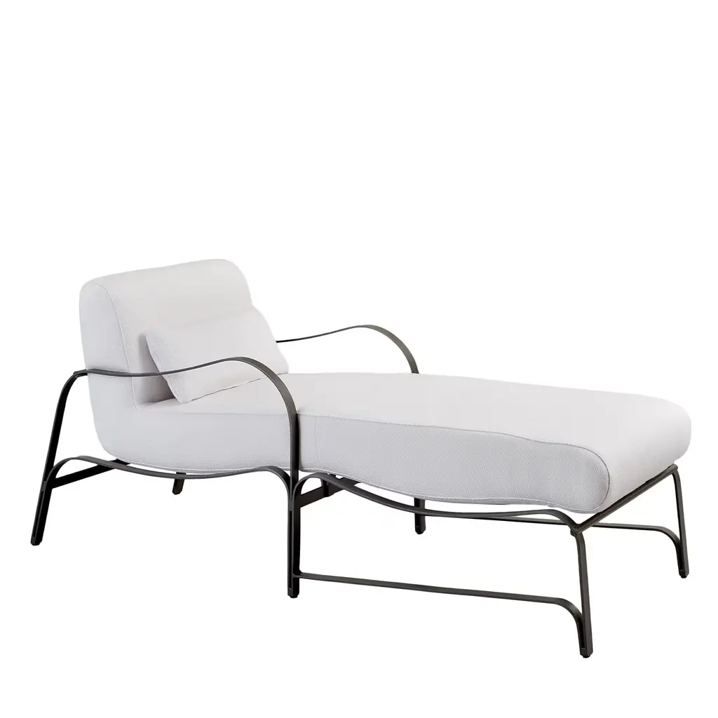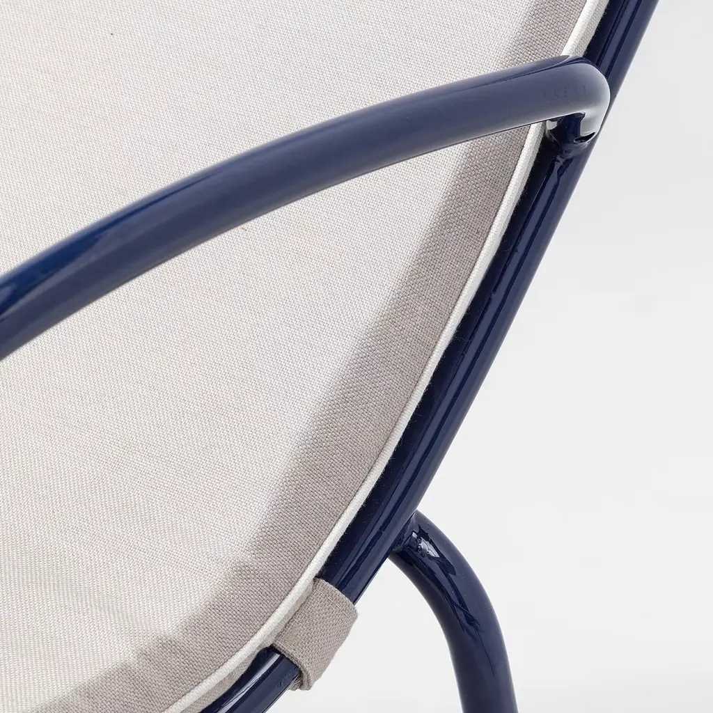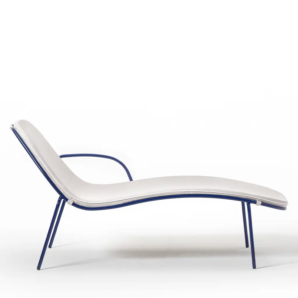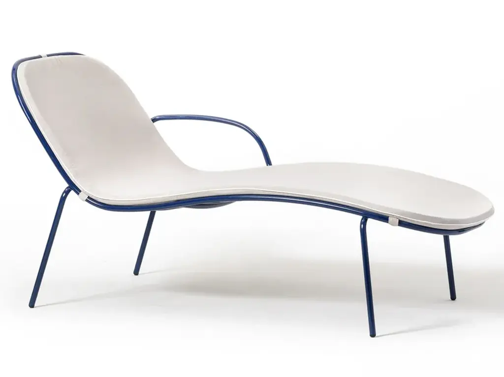 Soft curves trace the sleek and harmonious design of this outdoor sunbed. The cylindrical metal structure finished in cobalt blue (RAL 5013) also incorporates the armrest on the side, a detail amplifying the comfort of sunbathing sessions on terraces or pool areas. Wrapped in light fabric (CAT. D), a thin mat completes the design for impeccable comfort.