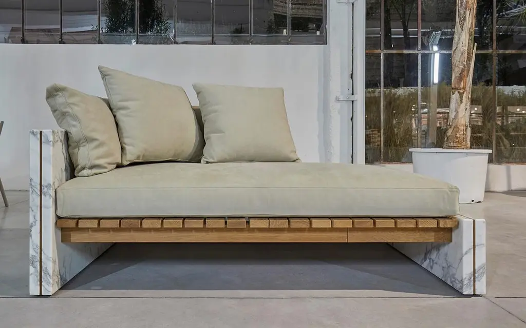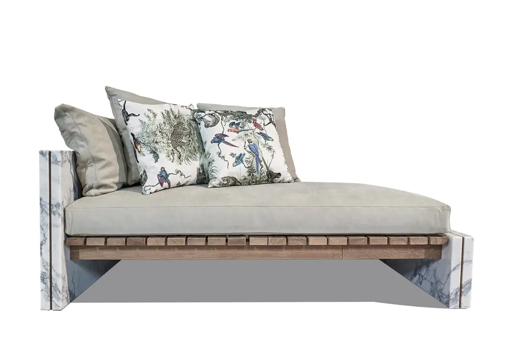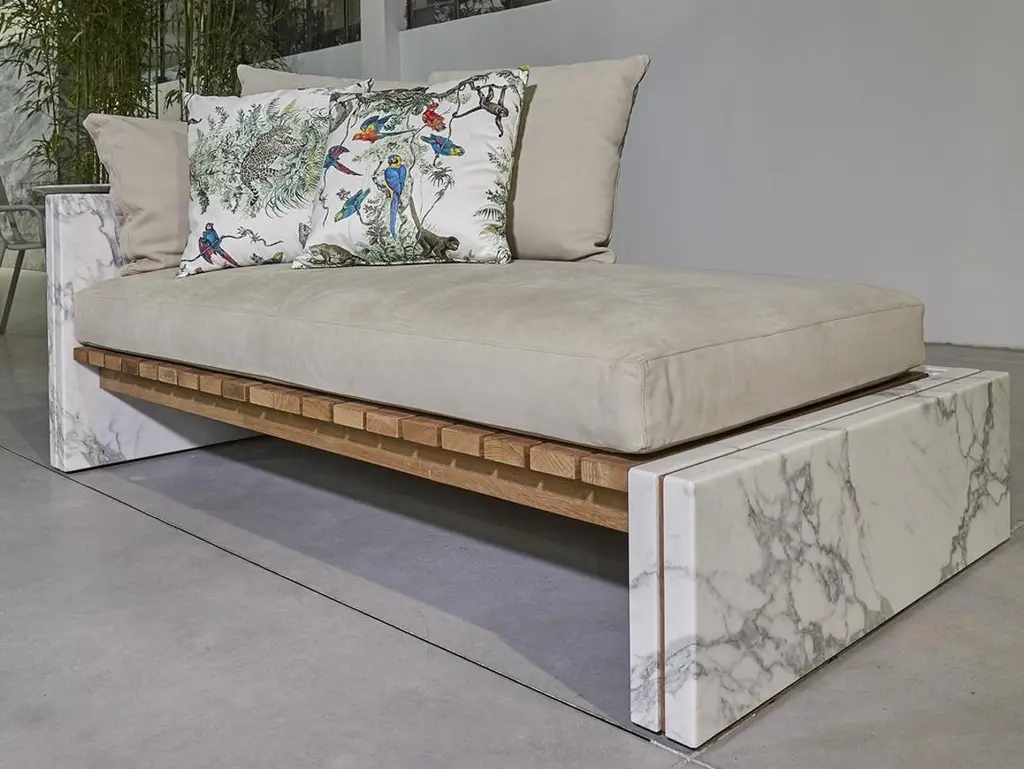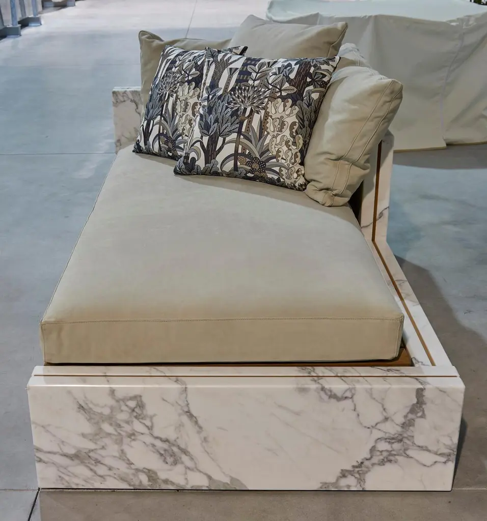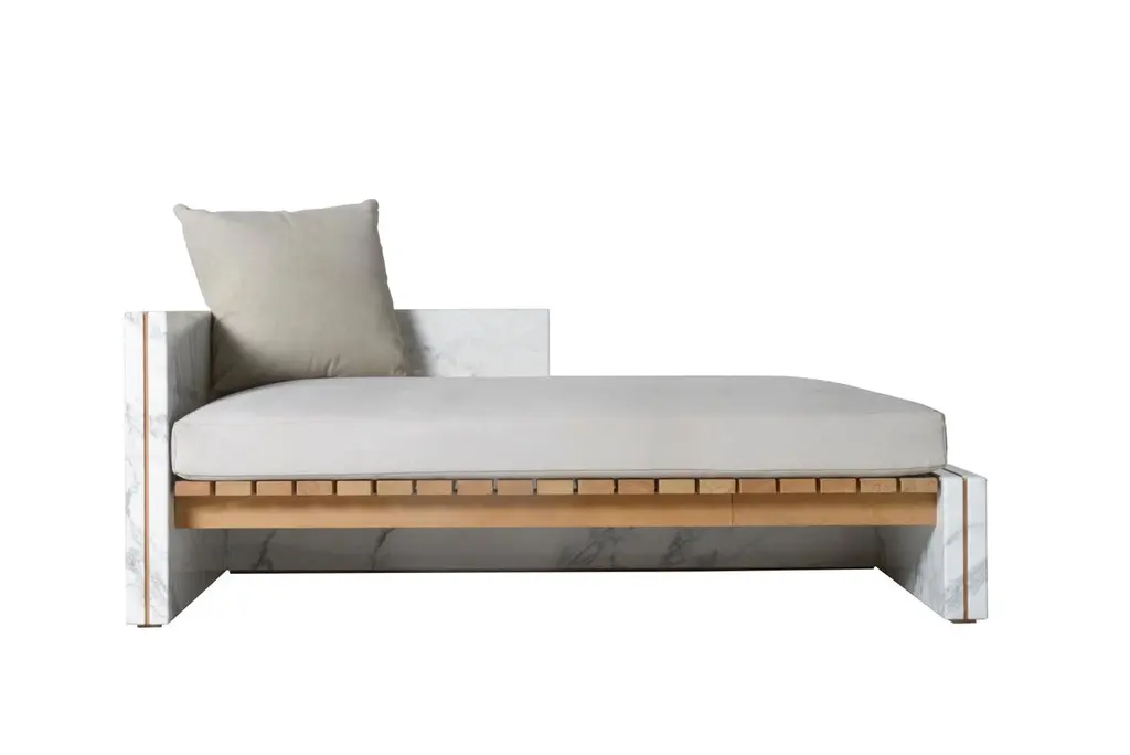 Bettogli chaise lounge is made in Statuario marble, a rare quality of marble that is extracted from the Bettogli quarries in North Tuscany where it gets the name from.The marble elegantly surrounds its occupant, with back and armrests that follow a continuous, rigorous, and essential line. The user feels at home in the unusual comfort of marble, assisted by seat cushions and furnishings. The idea of cold and aseptic material is lost and the user is plunged into a warm and exciting embrace.Materials: Carrara marble, teak and aluminumDesigned and made in Carrara, Italy. Available in Bianco Carrara option, and customizable cushions and upholstery.