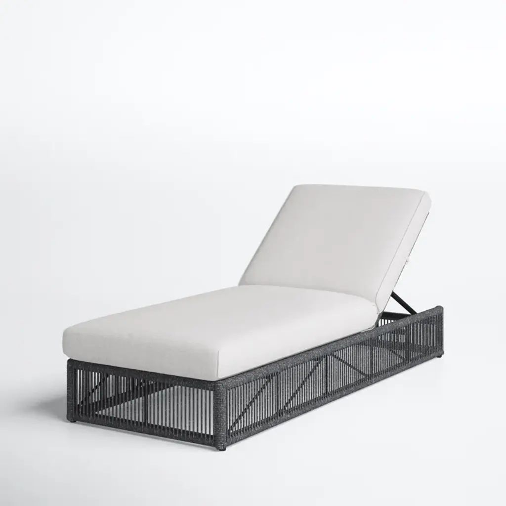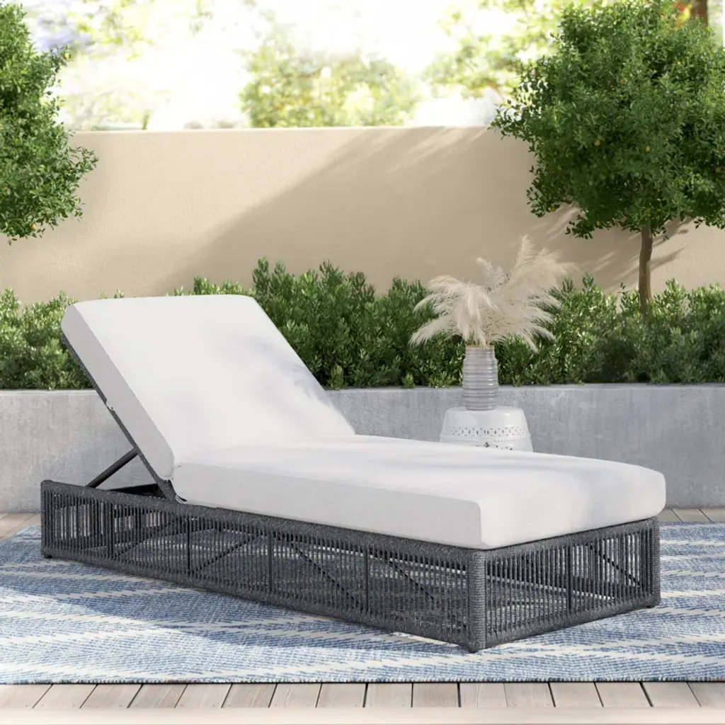 With its generously-sized frame and plush, foam-filled seat, this reclining chaise lounge is our pick for an everyday outdoor essential. It's made from a weather-resistant aluminum frame that's designed to stand up to rust and UV-rays. Its airy, open silhouette features a striated rope design throughout the rectangular frame. With five different reclining positions, it's super easy to get – and stay – comfortable. This chaise is finished off with a detachable, Sunbrella-upholstered seat and back cushions. Plus, it arrives fully assembled.