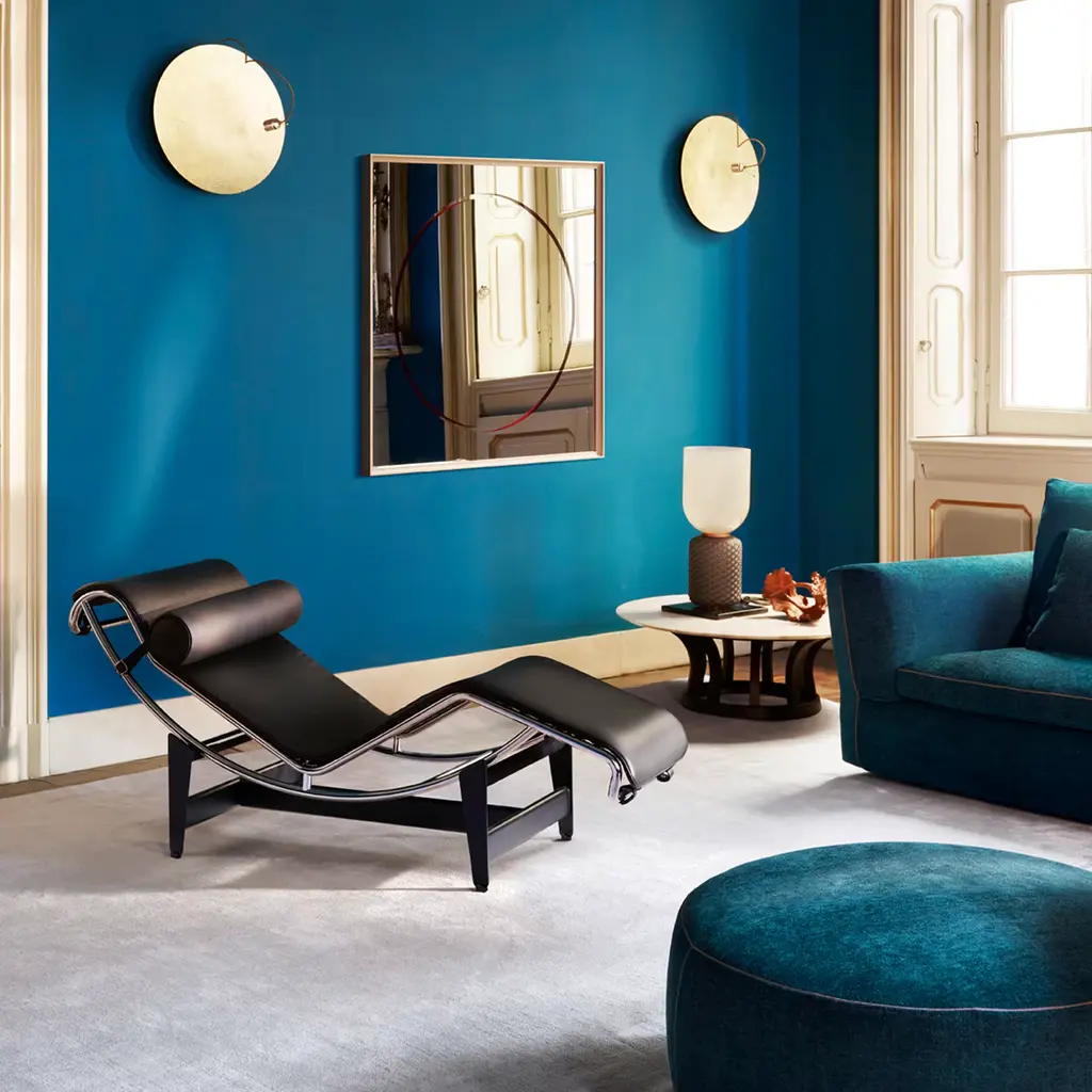 Chaise longue in black leather. One of Cassina’s worldwide best-sellers, the 4, Chaise Longue à reglage continu is the quintessential chaise longue, designed in 1928, and based on an in-depth exploration of reclining chairs. The three designers devised the 4, Chaise Longue à reglage continu as an expression of the concept of relaxation, with a focus on the human figure, the link between form and function being reflected in the balance between geometric purity and ergonomic intent. The stability of the lounger, whatever the angle of inclination, is provided by the rubber tubes covering the cross-bars of the underlying frame. As with the other models, the 4, Chaise Longue à reglage continu is based on measurements derived from the Modulor. Today this model is proposed again in the “full black” version, with black base, frame and upholstery.