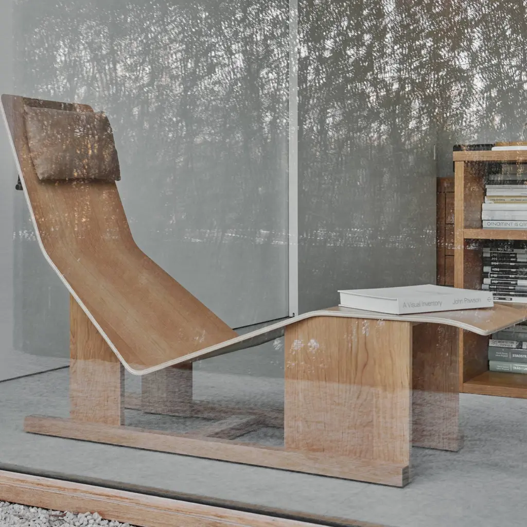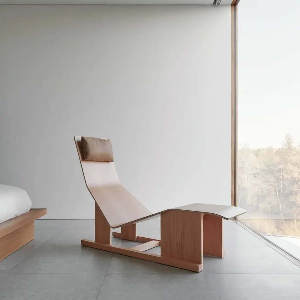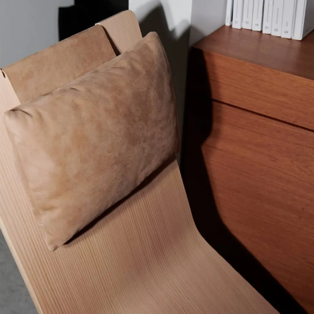 It’s always time for relaxation somewhere and designer Chris Martin’s 4PM Chaise delivers outstanding comfort from an unexpected combination of curved and flat wood surfaces. The tapering lounge’s shape also allows the user’s feet to fall comfortably on both sides, which in turn simplifies getting in or out. In Douglas fir, characterized by its warm tone and fine grain, or slightly darker cherry, it features a height-adjustable leather headrest, held in place by an enclosed steel weight.