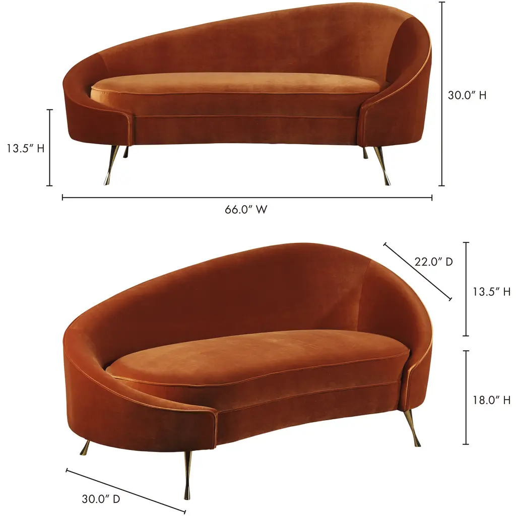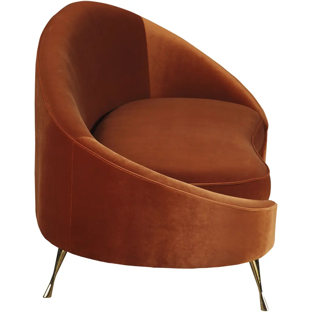 Take a seat on this beautiful retro cloud. An asymmetrical back, velvety softness, and gold stainless steel legs make the Abigail chaise. Perfect for the 60s-obsessed or anyone with impeccable taste.