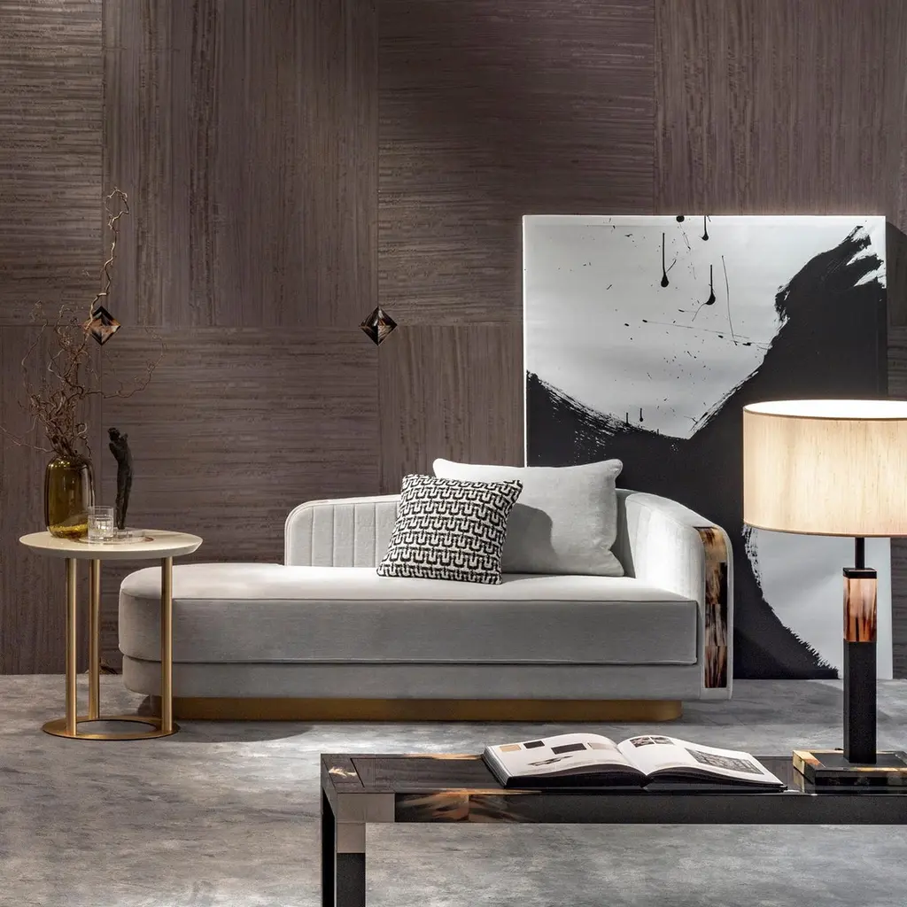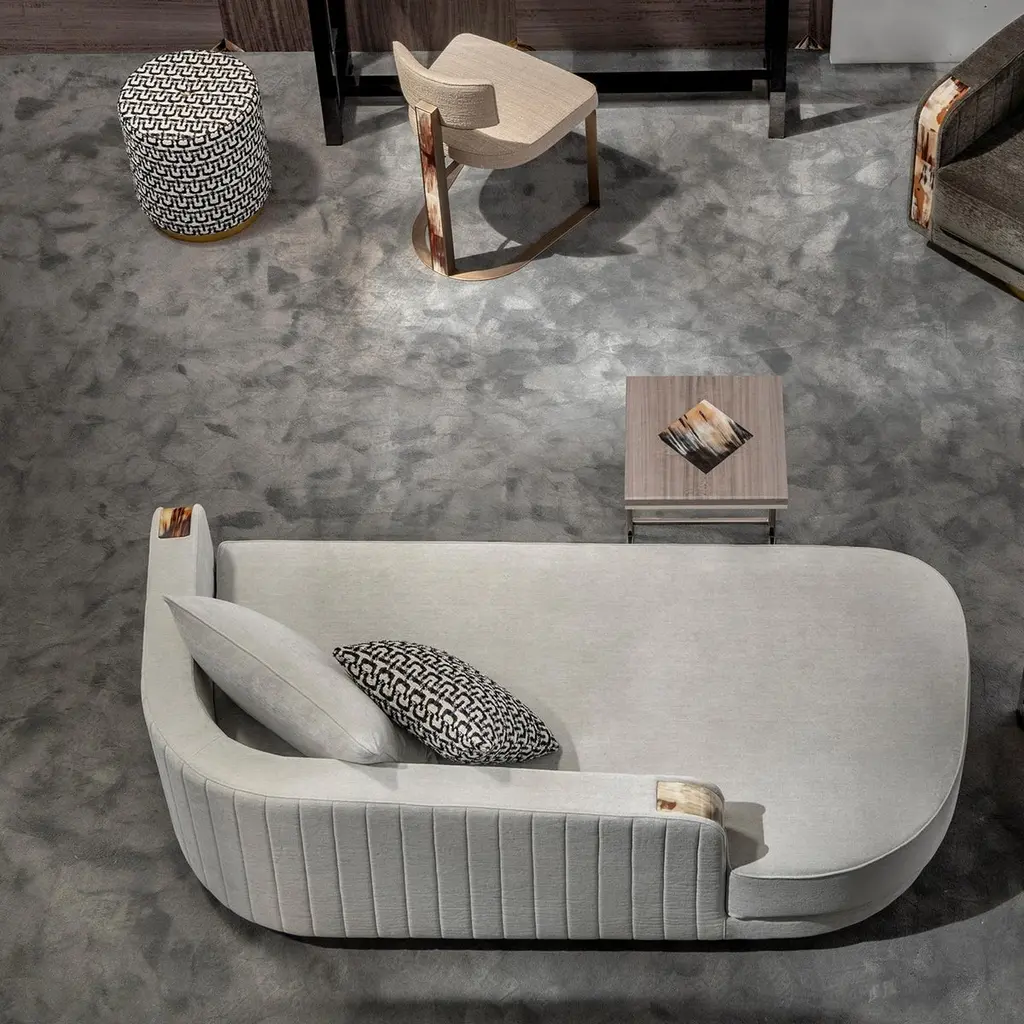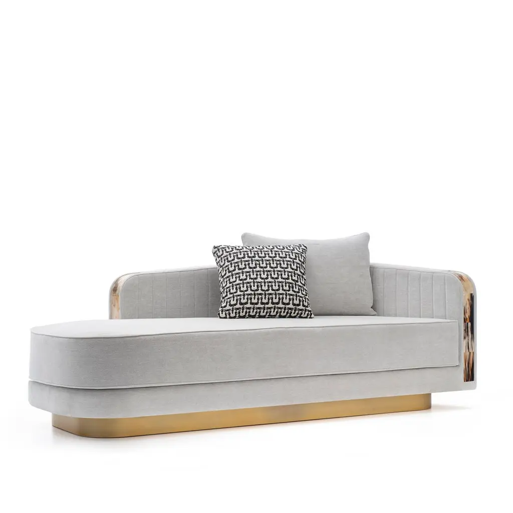 Ergonomically perfect and visually appealing, the Afrodite chaise lounge is defined by fluid lines and exquisite detailing. Its sinuous silhouette is accentuated by ribbed sides and back, while beautiful, curved accents in Corno Italiano add the most dramatic of touches. Proposed in a soft, cat. B, Belsuede chenille in Perle color, this chaise lounge is also available in multiple upholstery options. Padded with expanded polyurethane foam, goose down, and memory foam for supreme comfort, the design is completed by a glamourous base in lacquered wood with satin brass effect.Notes:- Colors and shades of Corno Italiano processed by our Company are unique and due to the natural origin of raw material. For this reason Corno Italiano tones that can be seen in pictures are indicative and can not be reproduced in finished products.- Price is referred to chaise lounge and decorative cushion upholstered in the same material and color. - When an element with armrest is ordered, specify in all cases whether left or right, always when facing the element.