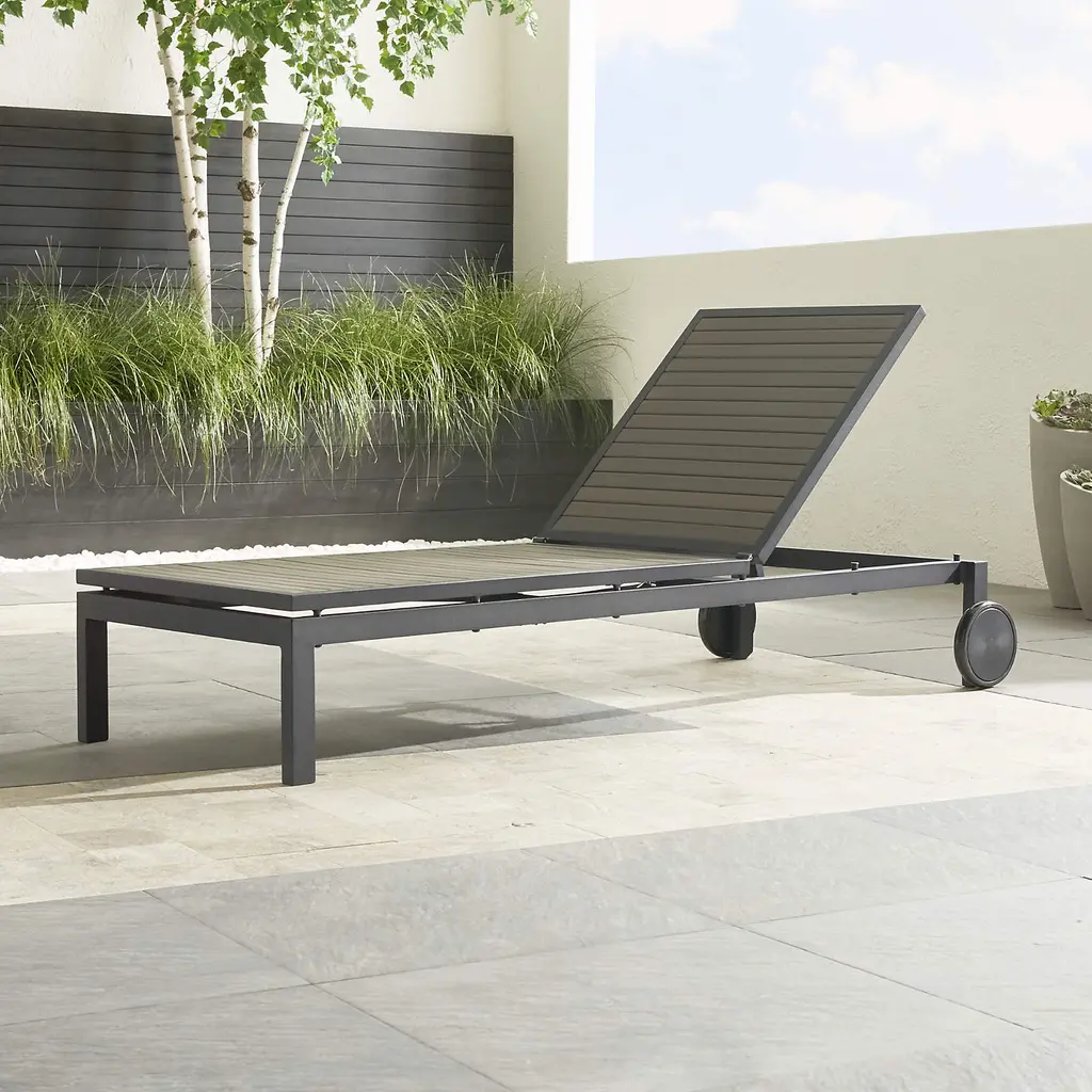 Our casual and stylish Alfresco outdoor chaise lounge fools the eye with its real wood appearance and fools the elements with water-, UV- and fade-resistant properties. Slatted polystyrene faux wood in warm grey is treated with UV and anti-oxidant protection.