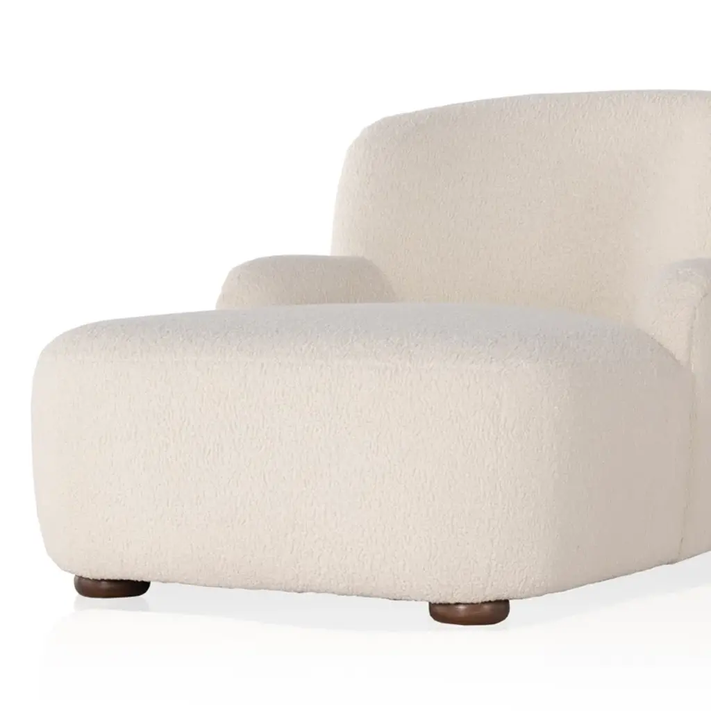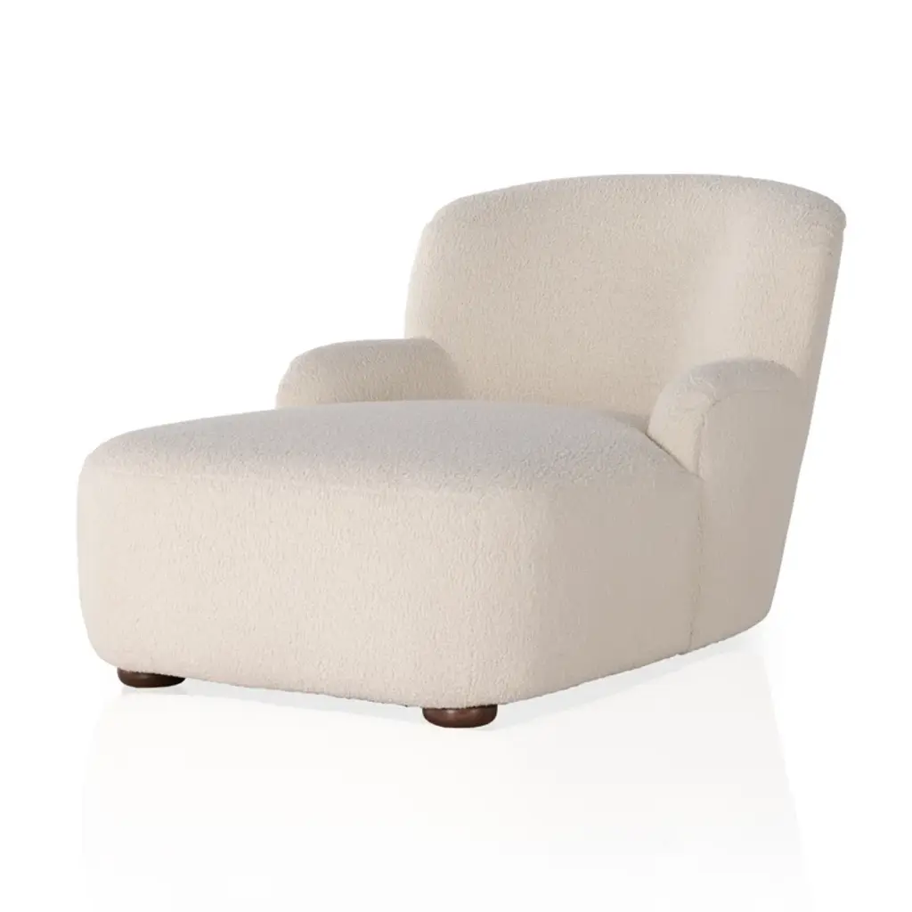 This indoor chaise lounge chair updates your relaxation game by taking a classic furniture piece and modernizing it. A high wing back pairs with softly recessed arms for a curvy look and supportive place to sit. It has a solid wood frame that rests on low-profile bun feet in a warm brown tone. Wrapped in neutral-hued, it's also foam-filled, inviting you to lean back and enjoy a brief snooze. This chair can easily accommodate up to 250 lbs.