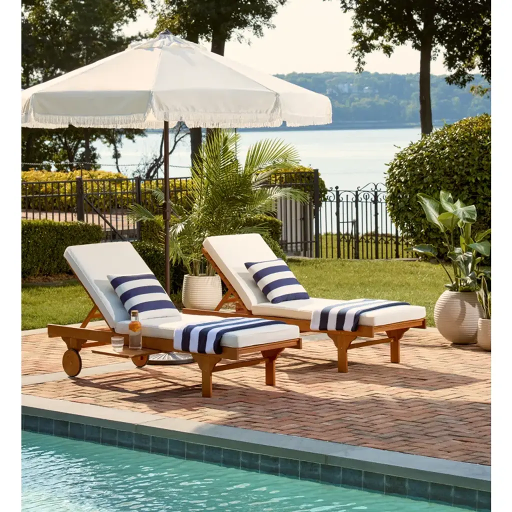 Is there any better way to spend a summer day than catching a few rays on the patio? Prepare for the rising temperature with this chaise lounge! Crafted from eucalyptus wood, this piece is perched atop two wheels for handy mobility, so you can get the perfect tan from any angle. This reclining design arrives with an included foam-filled polyester cushion for an inviting feel, while a weather-resistant construction makes it a smart selection for your outdoor ensemble.
