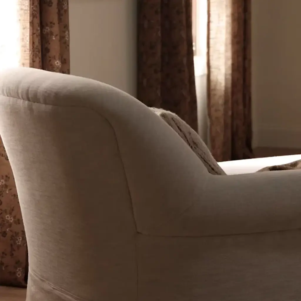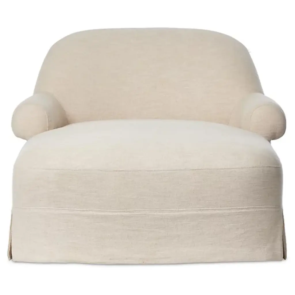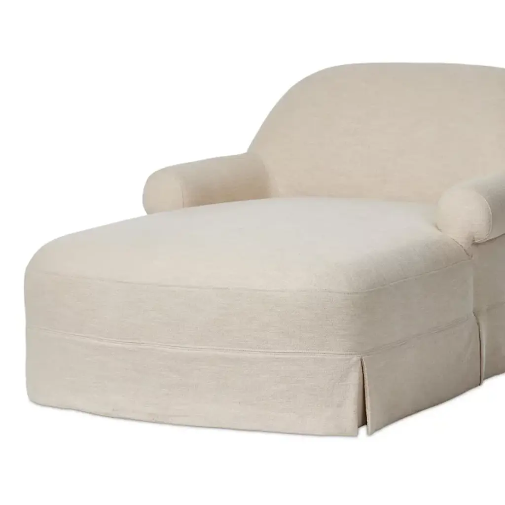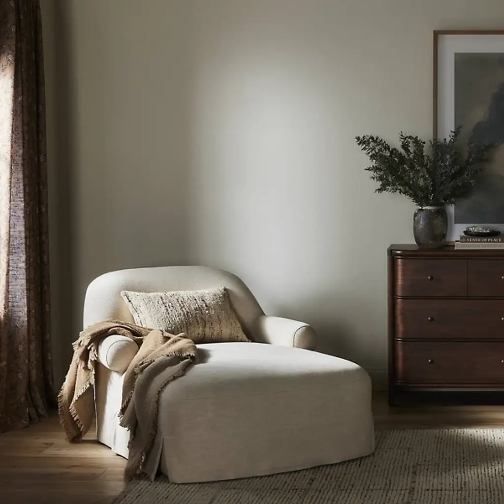 The Amber Lewis x Four Hands Arden Chaise Lounge extends the traditional English rolled armchair with generous proportions that invite full-body relaxation and lounging. Its casual cotton-linen slipcover softens formal lines while maintaining a tailored appearance. The high back provides proper head support during extended reading or napping sessions. S-spring suspension creates responsive comfort that adjusts to different reclining positions. This piece’s extended seat length accommodates various heights while encouraging complete relaxation.