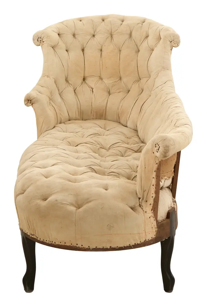 • muslin upholstery as found •tack nail trim •patinaed black ebonized wood legs •19th century •france Dimensions• 67"W x 32"D x 39.5"H •seat: 55"D x 16.5"H