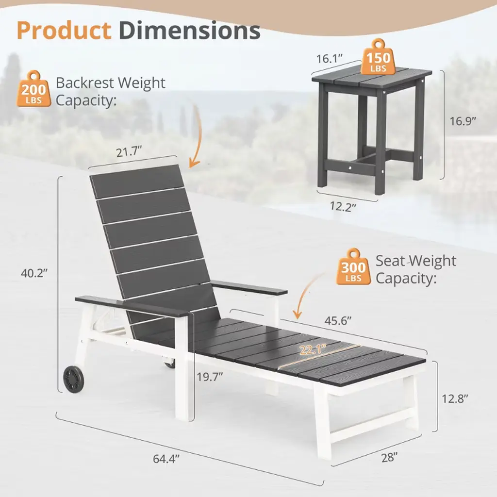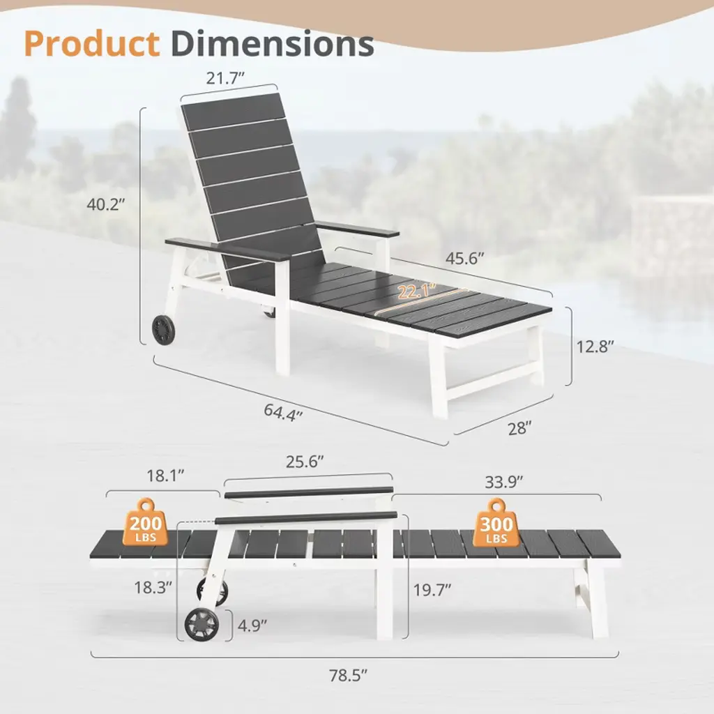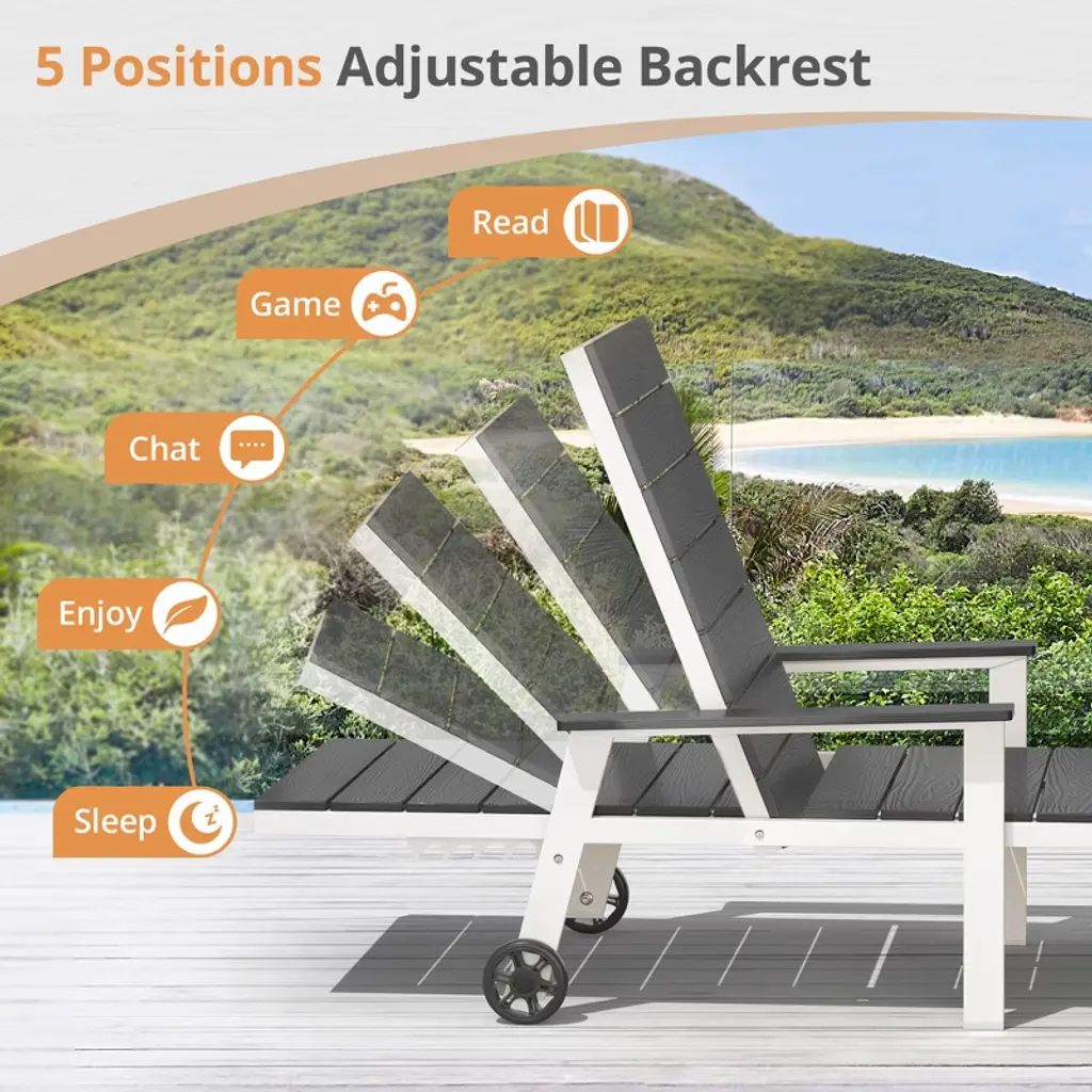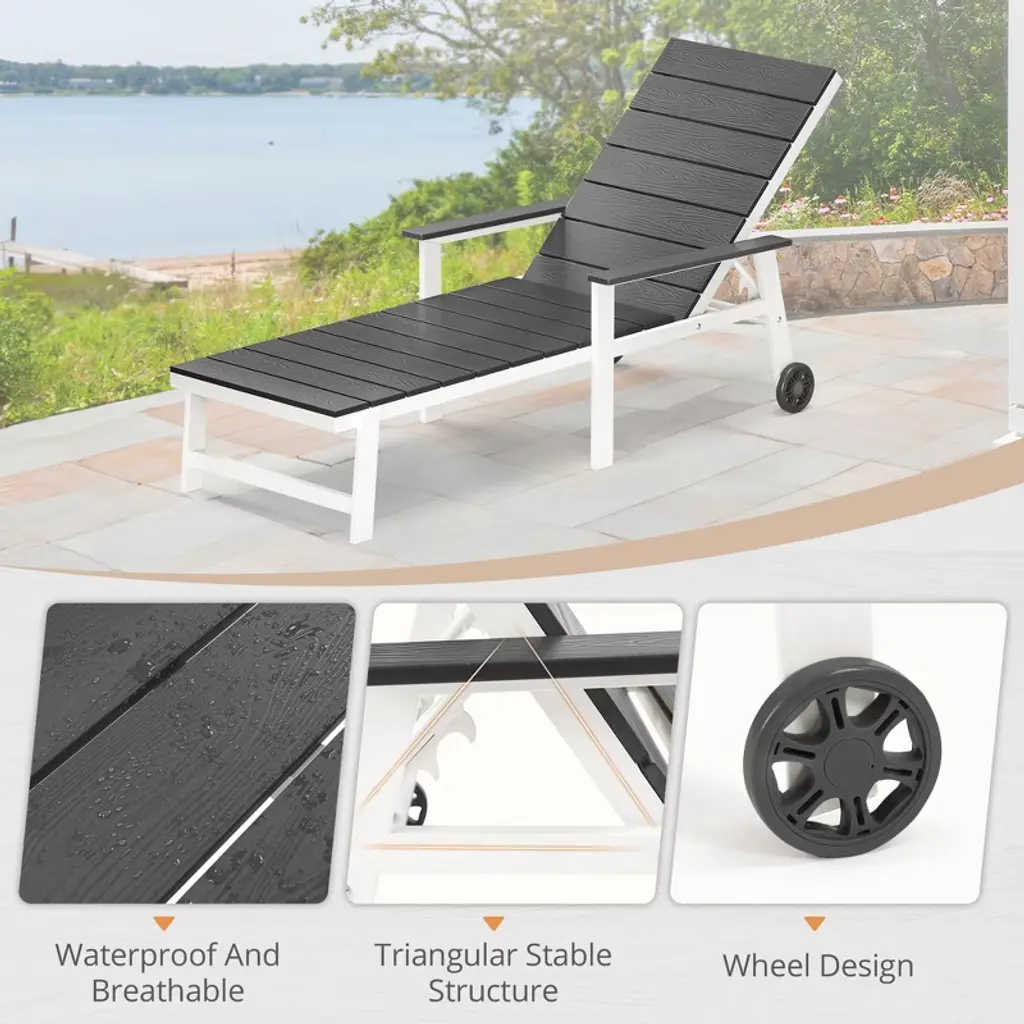 Weatherability HDPS Material: Crafted with HDPS material featuring a wood grain texture, the seat resists fading, cracking, and peeling, built to endure outdoor elements, and water stains can be effortlessly removed with a dry cloth Sturdy Aluminum Frame: The chair¡¯s strong aluminum frame offers a perfect balance of portability and strength,designed with a triangular structure and secured with 304 stainless steel screws,it won¡¯t fade or rust Adjustable Backrest: Relax in comfort with a backrest that adjusts to five different positions,the ergonomic design supports your back and reduces fatigue,while the slatted structure promotes airflow and prevents water buildup,ideal for sunbathing or casual lounging Convenient and Flexible Design: Equipped with two large wheels,this pool chair is easy to move and adjust to your ideal position,the wide armrests provide great support,making it the perfect addition for gatherings or creating a cozy outdoor relaxation spot Easy Maintenance: : Forget about the hassle of upkeep,unlike traditional wood chairs,this pool lounge chair cleans easily with just soapy water,saving you time and effort,so you can spend more time enjoying the outdoors