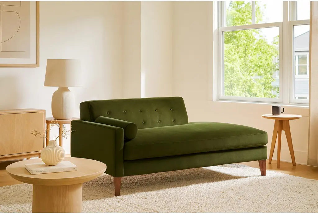 Whether you see it as your sophisticated solo lounge or a chic destination for guests, our Archie green velvet performance fabric accent chaise adds stylish seating to any space. A mid-century modern inspired design looks clean and inviting and boasts tailored details, including its tufted back, track arm and tapered legs. A bolster pillow elevates this piece, and through our Special Order program, you can customize the fabric at no extra charge.