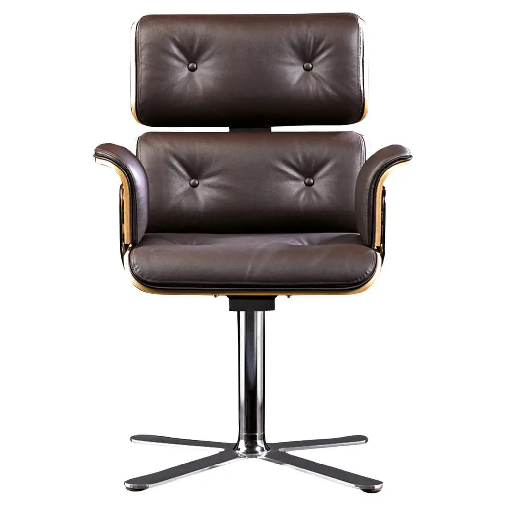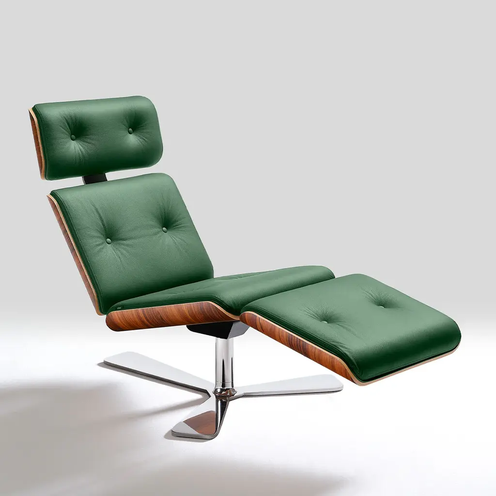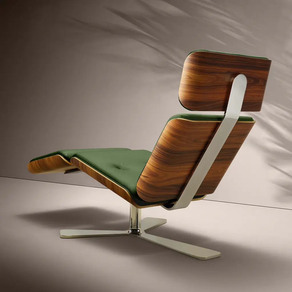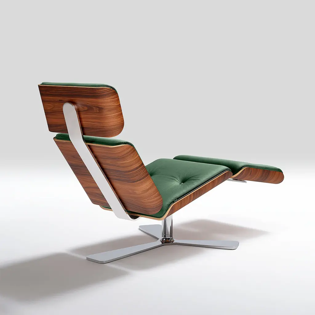 The Armadillo/7 is a luxury chaise longue by Rainer Bachschmid that combines design and high quality materials without sacrificing comfort. Distinguished by an inviting ergonomic position, the padded seat cushions are upholstered in white genuine leather, each embellished with two-button tufting, and enclosed in back side shells of Canaletto walnut-veneered plywood. The three-star flat base of chromed steel provides a solid balance while keeping the design light and extremely elegant. This chair ships fully assembled.