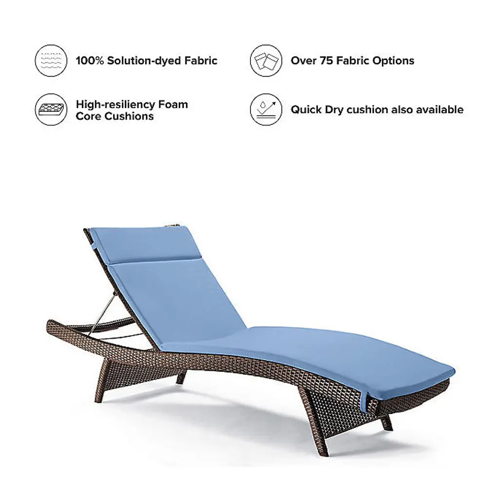 Refresh your Balencia Chaise with outdoor cushions tailored for a perfect fit. Made of premium Sunbrella® fabric and densified polyester fill, our cushions are constructed to last season after season. Choose from our classic knife edge design, or Corded cushion with Sunbrella outdoor cord trim. Tailored specifically to fit our Balencia Chaise Lounge Strong straps easily secure cushion to chair Durable 100% solution-dyed Sunbrella® acrylic Colors coordinate with our exclusive line of Frontgate fabrics Cushion made of high-quality densified polyester fill Extreme tested for resistance to fading, staining and mildew Spot clean Sewn closed on both the Standard and Quick Dry cushion types Imported Type of Cushion: Standard: Multiple layers of high-resiliency, high-density foam core with soft polyester wrap.Quick Dry: Faster drainage and 35% faster dry time. Open-cell foam wrapped with densified polyester and a quick-dry center, lined for extra comfort. Removable cover has mesh panel on the bottom for maximum drainage.At Frontgate, our primary focus is quality. We guarantee that every product we sell will stand up to the supreme test – our customers' satisfaction. To learn more about our policies, visit our Shipping & Processing, Returns & Exchanges and Warranty & Price Guarantee pages.