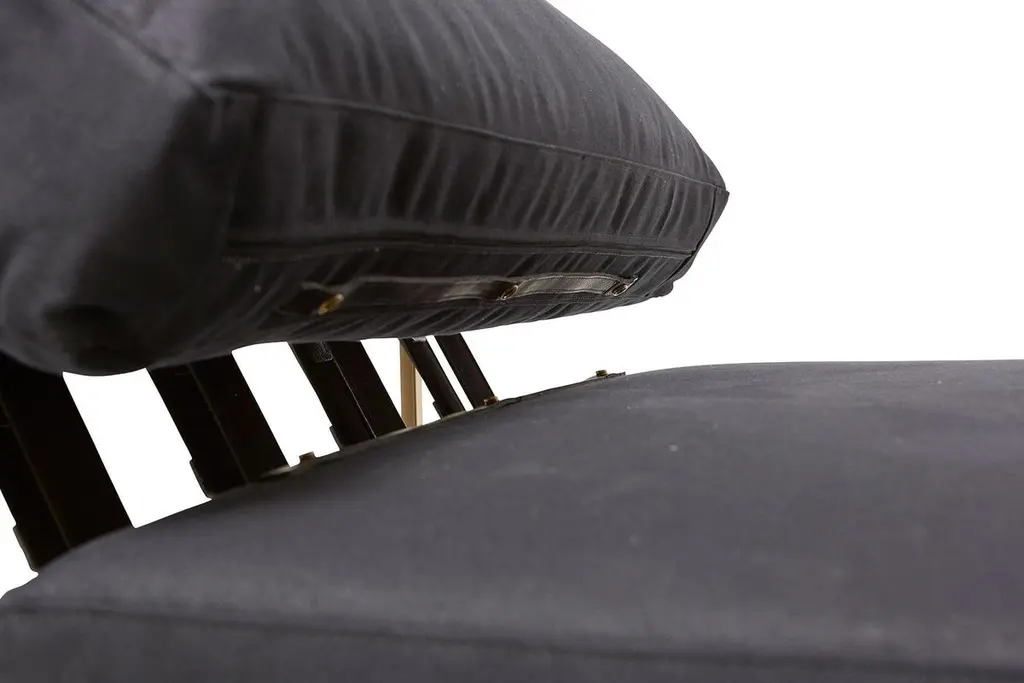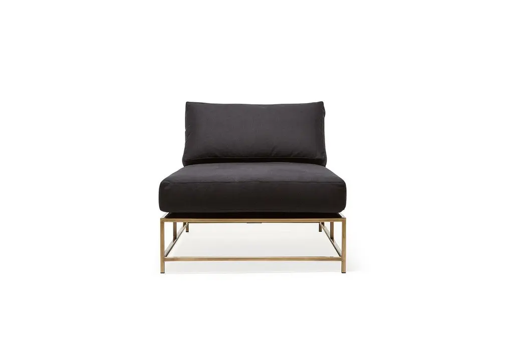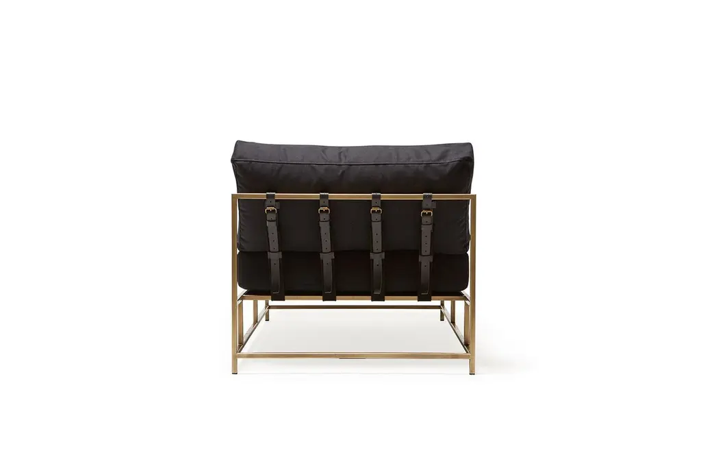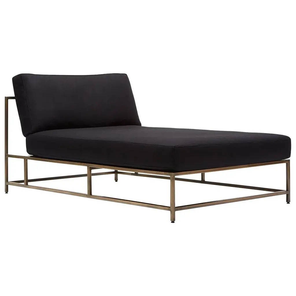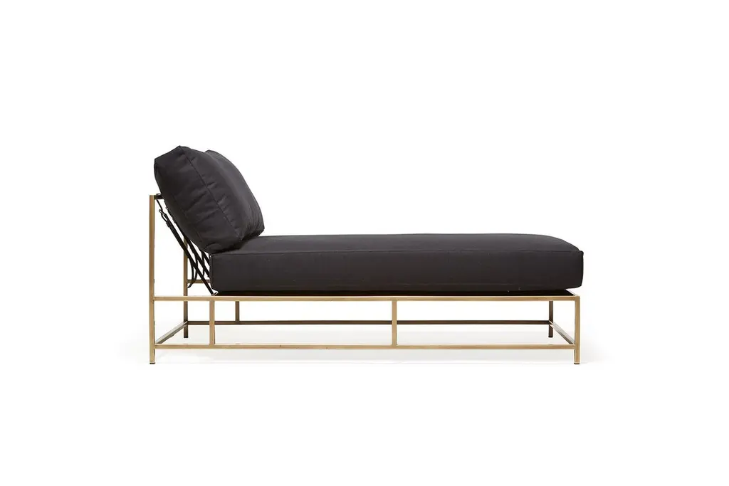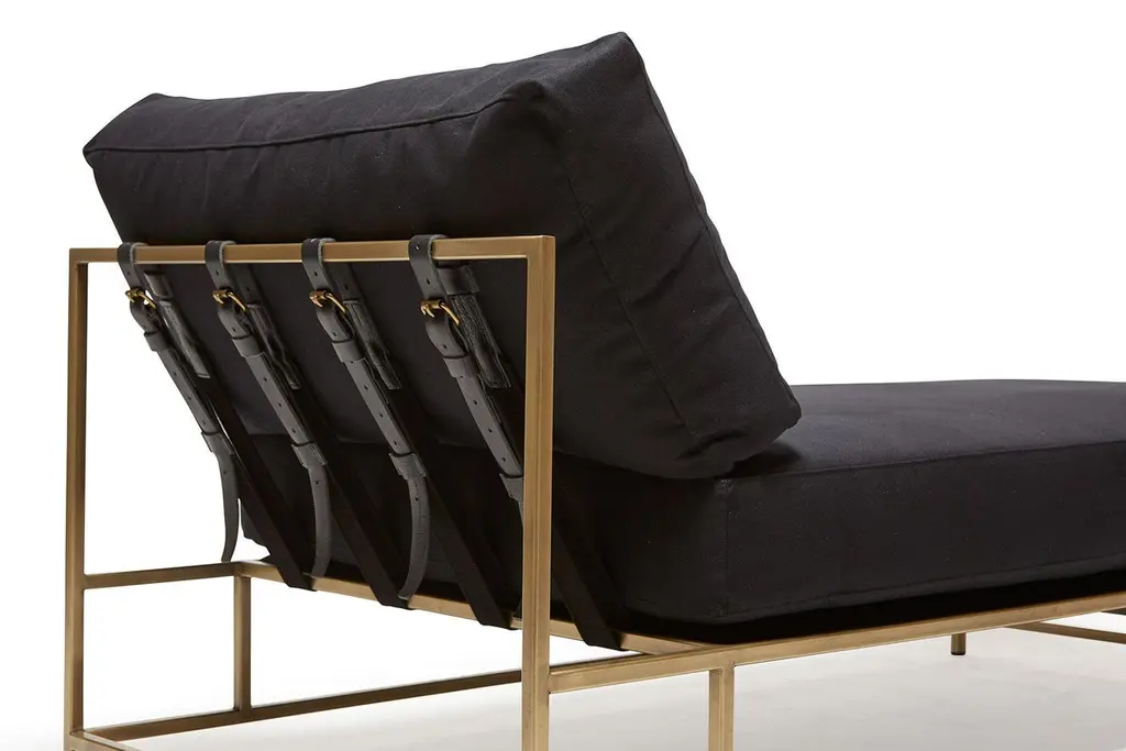 The Inheritance Chaise Lounge by Stephen Kenn is as comfortable as it is unique. The design features an exposed construction composed of three elements - a steel frame, plush upholstery, and supportive belts. The deep seating area is perfect for a relaxing lounge experience. This chaise lounge comes with removable cushion covers to allow for easy cleaning should the need arise. Every Stephen Kenn piece is made to order through our Los Angeles studio in partnership with a number of small businesses and fabricators in the LA area. With this highly customizable chaise lounge you can select from a wide range of finishes and materials to complement your home and lifestyle - please message us to see our Customization Guide with all available options.This version of our Inheritance Chaise Lounge is upholstered in black canvas. The foam seat cushions have been wrapped in polyfiber for added softness and comfort. Sitting atop an antique brass plated steel frame, the piece has support belts featuring black cotton webbing, black leather, and antique brass buckles.