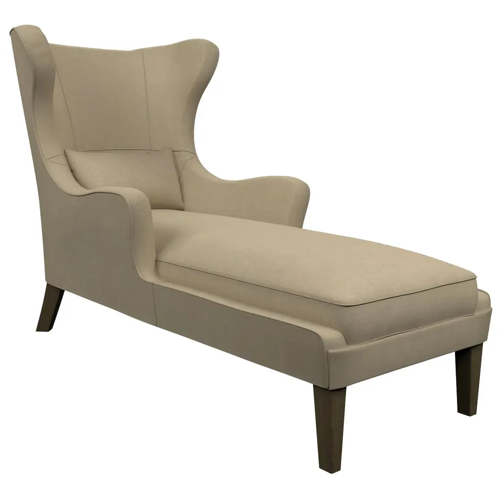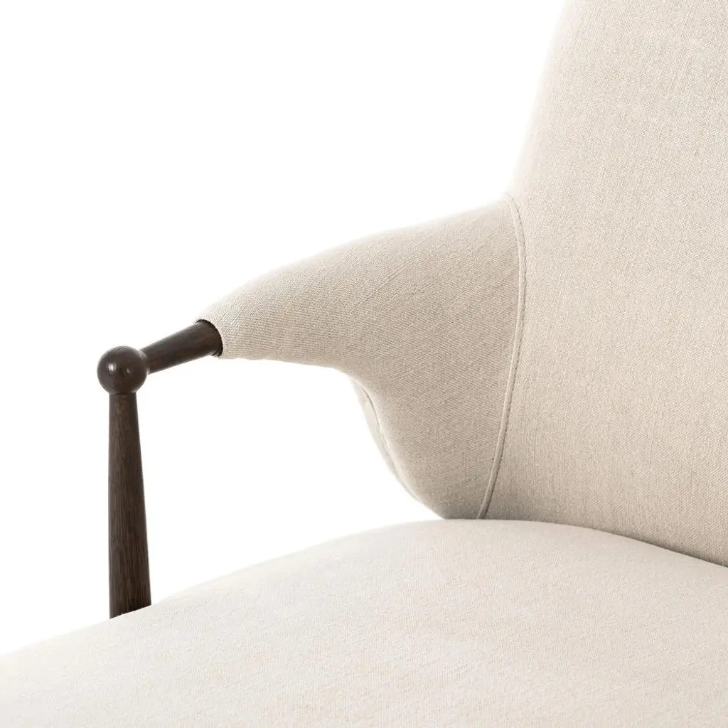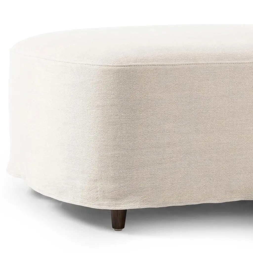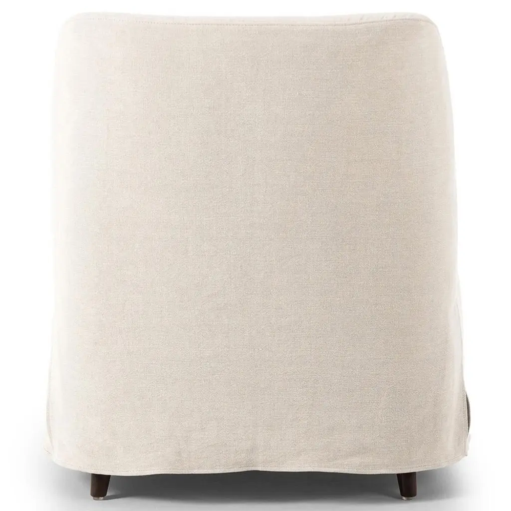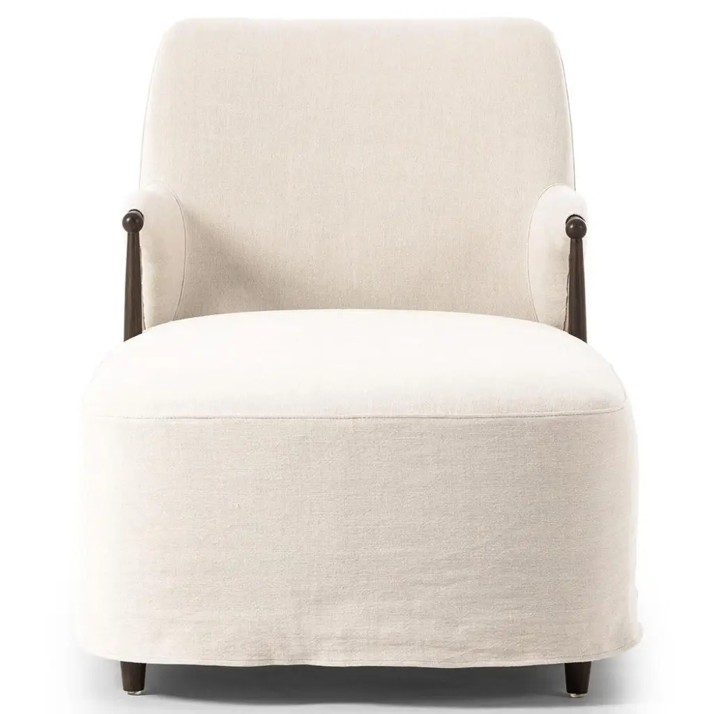 A design collaboration by Amber Lewis and Four Hands. A new take on the classic chaise form, featuring a fixed linen blend slipcover that comes together seamlessly with distressed oak wood arms and feet. The sloping silhouette allows for the slipcover to drape into a skirt at the base. A comfortable S-spring seat design invites you to settle in.