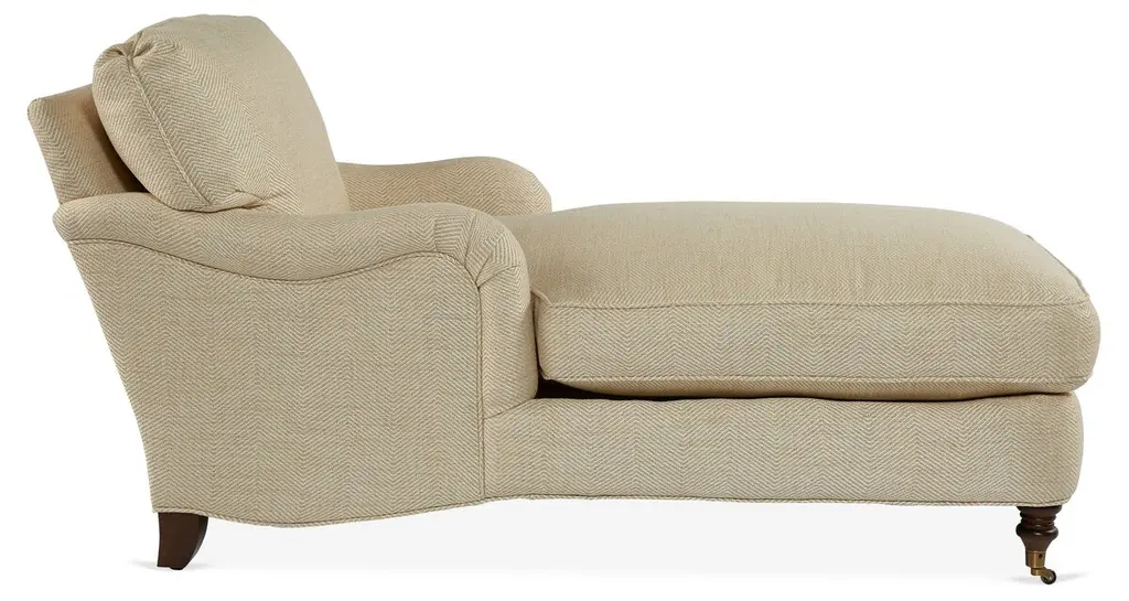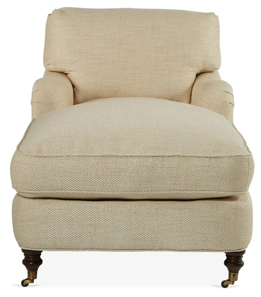 Designed by us and available only at One Kings Lane: A timeless addition to the bedroom or living space, this chaise is framed in kiln-dried hardwood with English arms and neatly tailored upholstery filled with feathers and down. Caster wheels on the chaise's finely turned front legs ensure easy mobility and scratch-free surface protection.