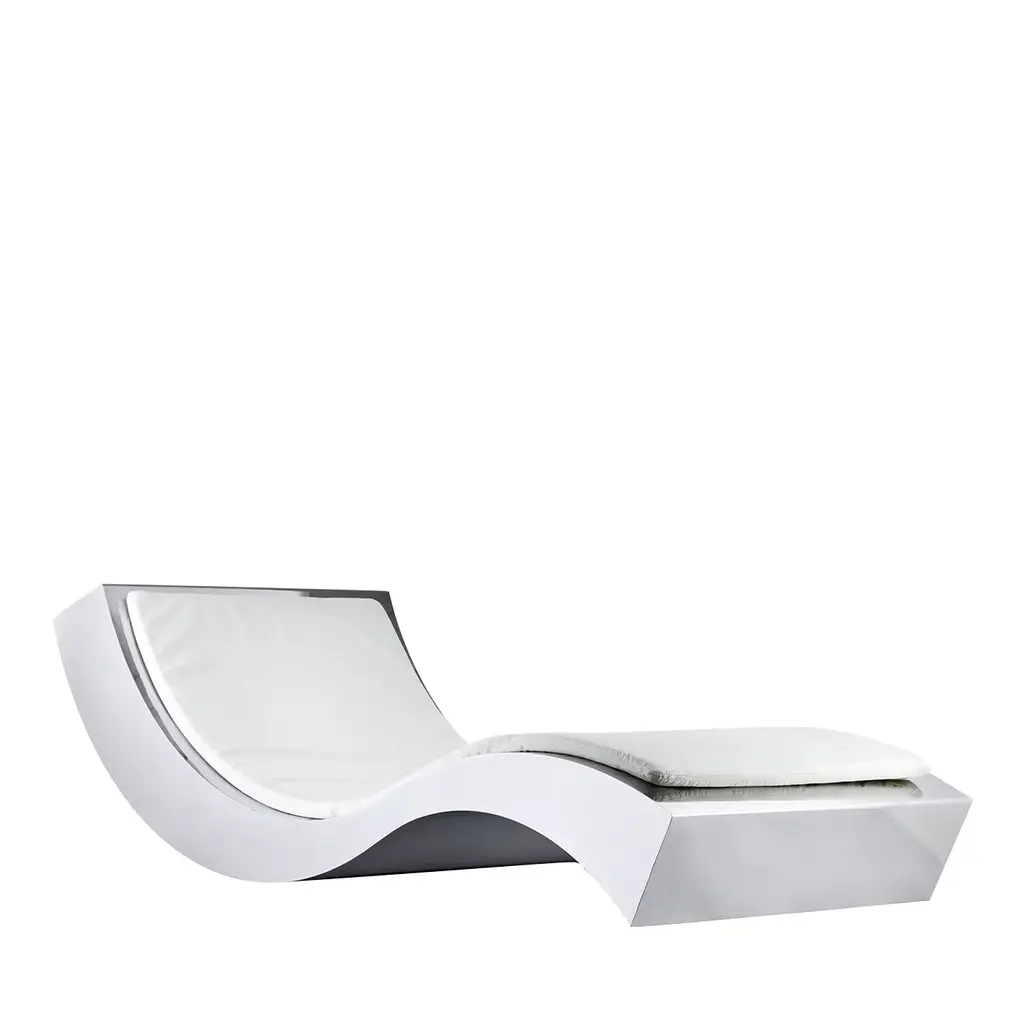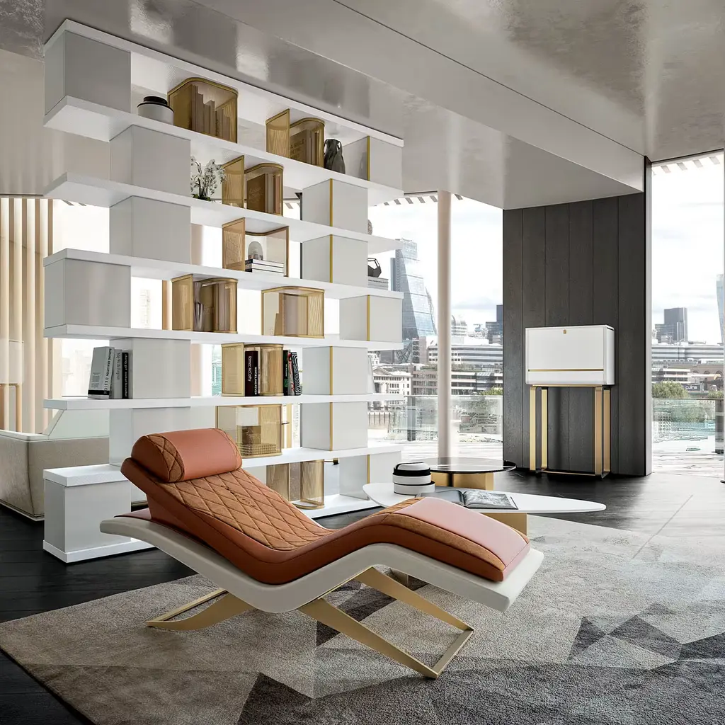 Gracefully flowing in its design, this chaise longue merges a wooden and bronze frame with luxurious quilted leather upholstery. The sleek lines and ergonomic shape make it not only a visually striking piece but also a haven of comfort. Perfect for contemporary interiors, it offers a balance of form and function, inviting you to relax in style while making a bold design statement in any living space or lounge area.