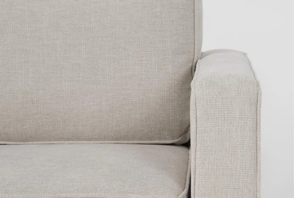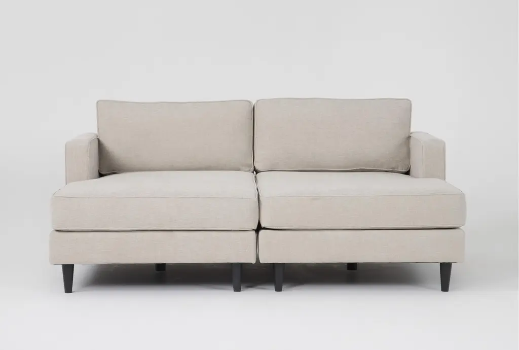 Introducing the Calais III Linen 79" Double Chaise Lounge, a perfect addition to your living room. This modern chaise lounge features a sleek design with track arms and tapered legs, providing both style and comfort. Upholstered in linen-colored fabric, it offers a neutral and soft color palette that complements any decor.